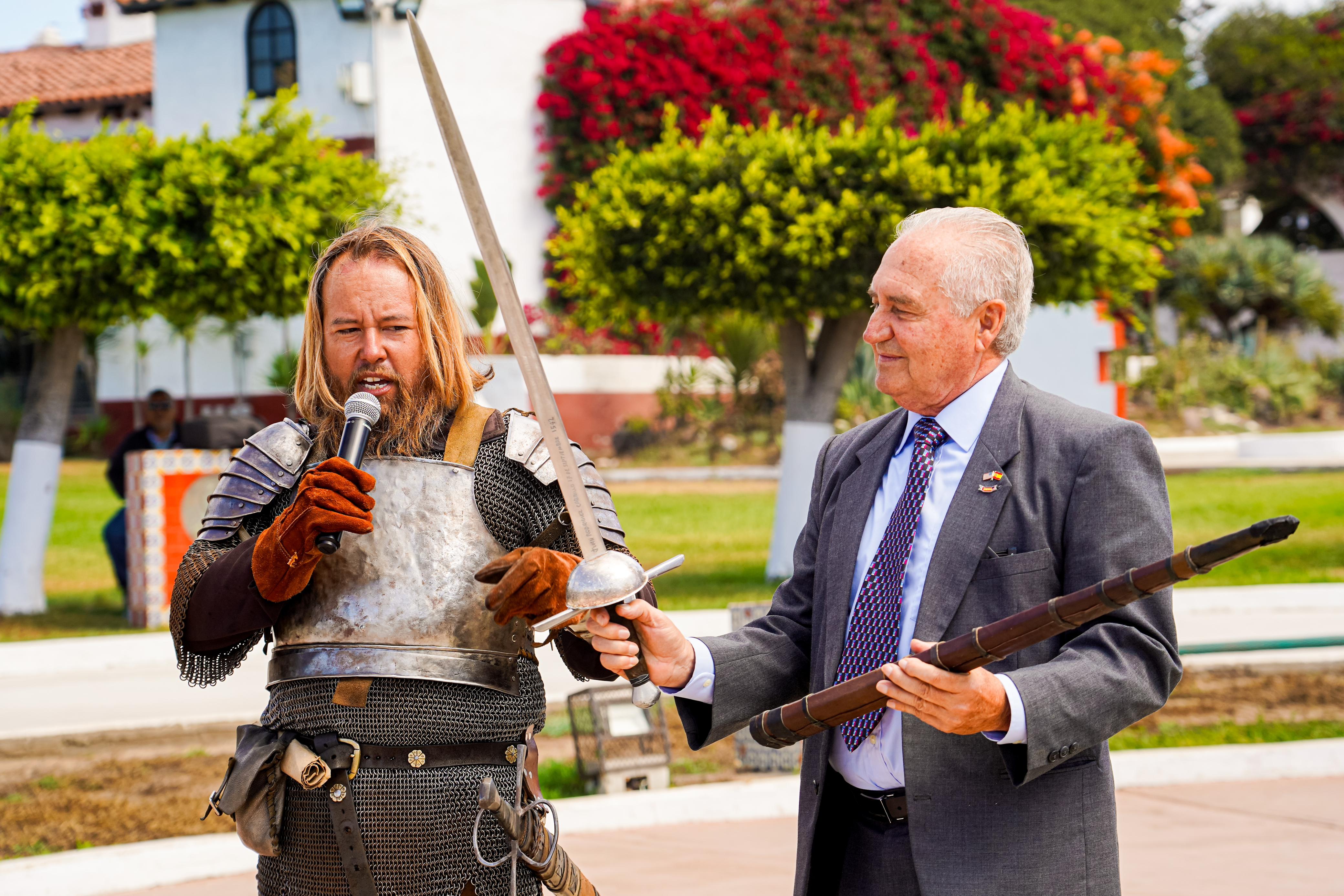 Para izar las banderas respectivas de los países mencionados y hacer honores al himno nacional de cada uno, participaron también Tomás David Paz Félix, representante de la Casa de España; Edalmiro Manuel Ferrera Da Rosa, cónsul de Portugal en San Diego, California y Jesús Banayas, presidente de Festival Cabrillo de San Diego y representante de Estados Unidos, quien además recibió una espada hecha artesanalmente con hierro forjado por parte de Nikki Flores Moreno, del grupo de esgrimistas.