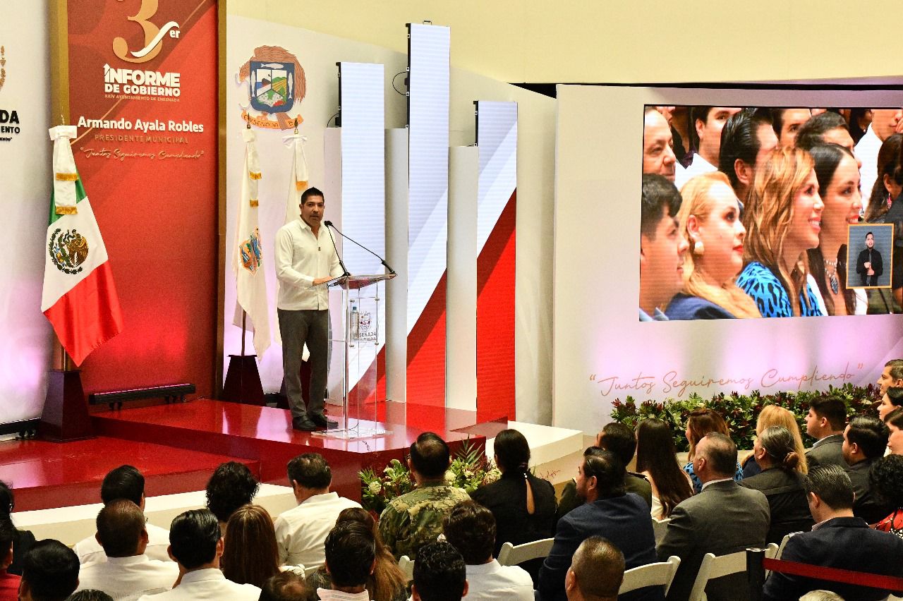 En su tercer informe de labores al frente del XXIV Ayuntamiento de Ensenada y quinto -consecutivo- como presidente municipal, expresó su gratitud a la comunidad por la confianza otorgada, a autoridades federales, estatales e iniciativa privada que se sumaron a este proyecto transformador.