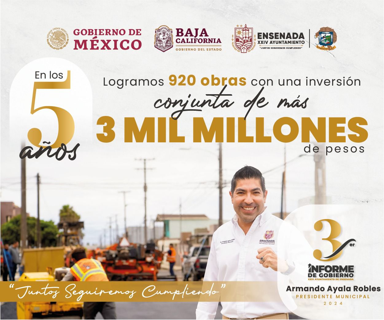 Ensenada,B.C.- Domingo 4 de agosto de 2024.- En vísperas del Tercer Informe de Gobierno, el presidente municipal Armando Ayala Robles aseveró que en los últimos cinco años, en Ensenada se hizo una inversión conjunta de los tres órdenes de gobierno y la iniciativa privada superior a los 3 mil millones de pesos.