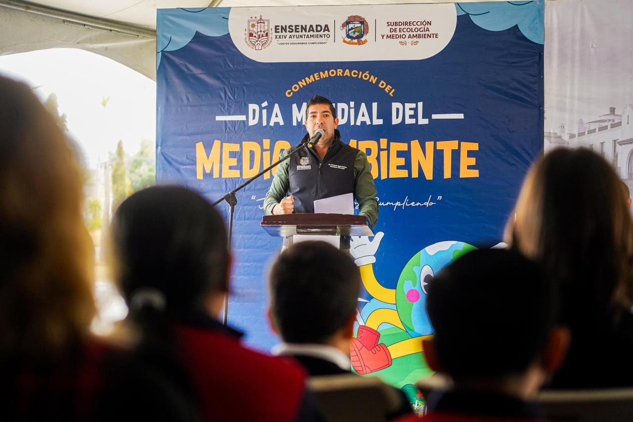 Ensenada, B. C.- Miércoles 5 de junio de 2024.- Haciendo un llamado a las y los infantes a promover el cuidado de su entorno y no dejar residuos en las playas, el presidente municipal, Armando Ayala Robles, encabezó la conmemoración del Día Mundial del Medio Ambiente que se llevó a cabo en la explanada del Centro de Gobierno, a donde acudieron más de un centenar de estudiantes de primaria y secundaria.