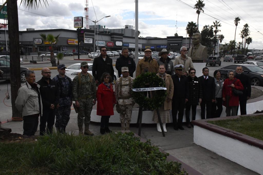 Ensenada, B. C.- Miércoles 3 de enero de 2024.- En el marco del centenario de la muerte de Felipe Carrillo Puerto, autoridades civiles, militares y culturales llevaron a cabo una ceremonia cívica frente al busto en su honor, ubicado en la calle Cuarta y avenida Reforma.