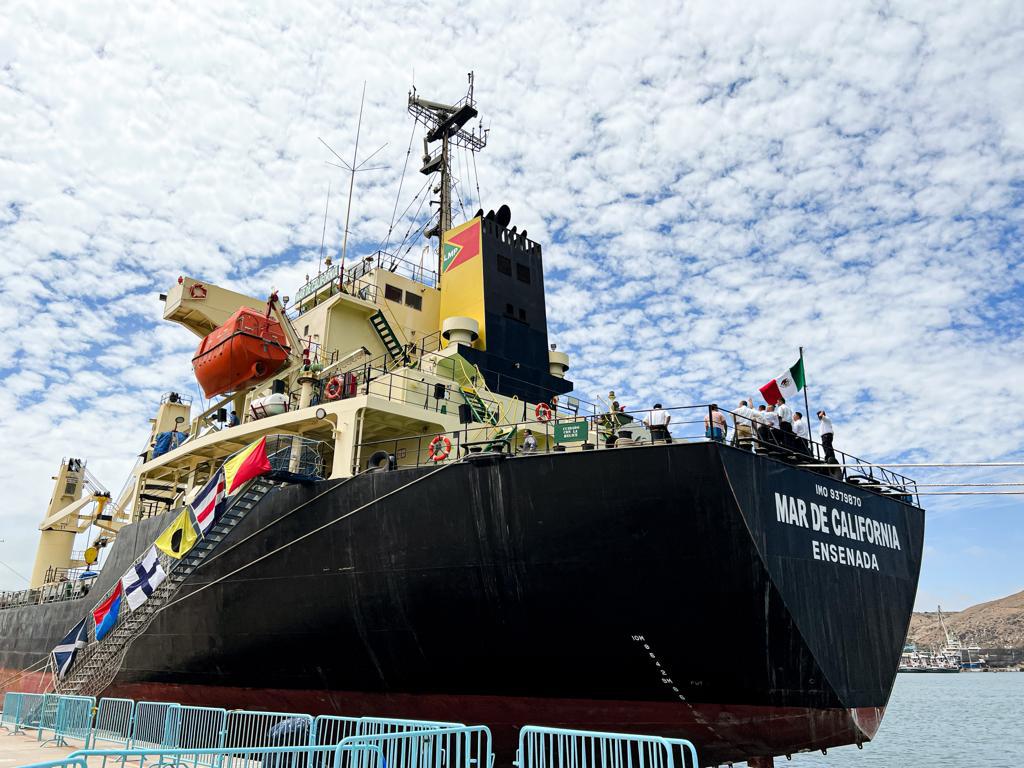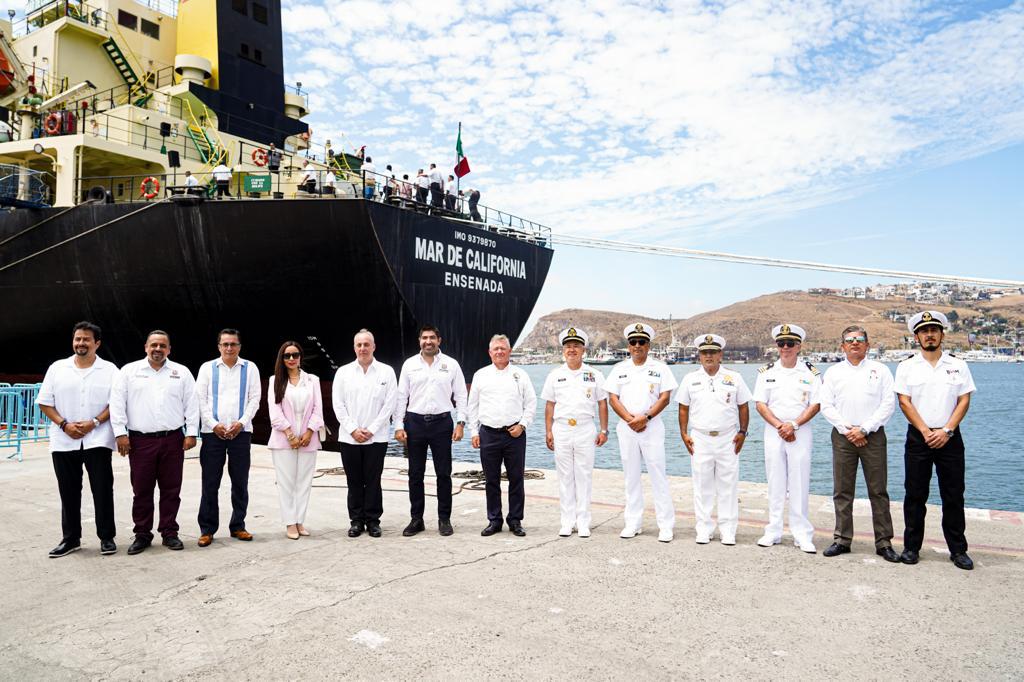 Lo anterior, durante su participación en abanderamiento del navío con matrícula de Ensenada, que tiene una eslora de 128.350 metros; una manga de 23 metros; y un puntal de 11.5 metros, que encabezaron la Línea Marítima del Pacifico y la Administración del Sistema Portuario Nacional de Ensenada (ASIPONA).