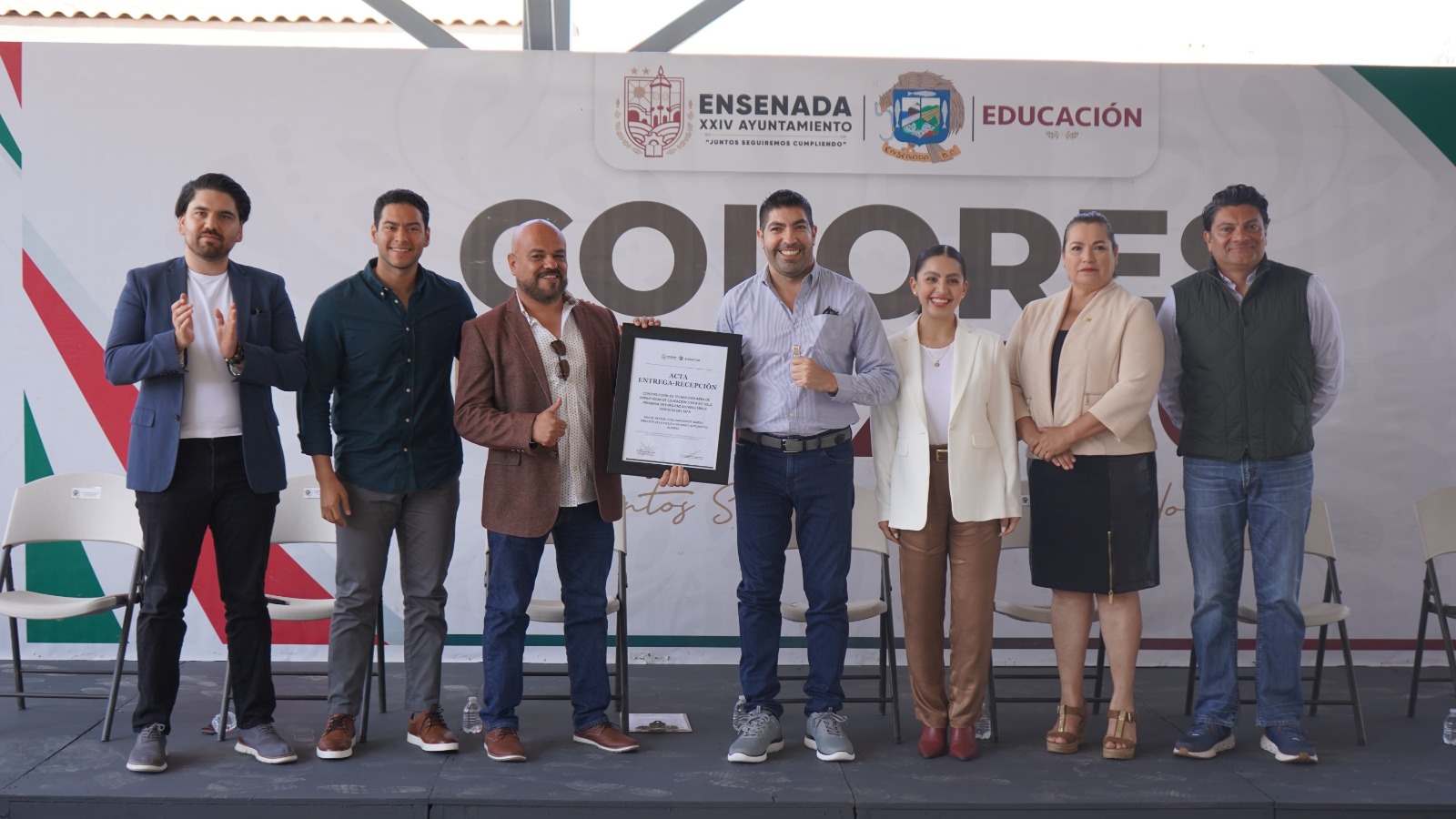 Ensenada, B. C.- Lunes 26 de junio de 2023.- Con una inversión superior al 1.3 millones de pesos del programa federal Ramo 33, esta mañana el alcalde de Ensenada, Armando Ayala Robles, hizo entrega oficial del techado de la explanada cívica de la Escuela Primaria “Arturo Paz Álvarez”.