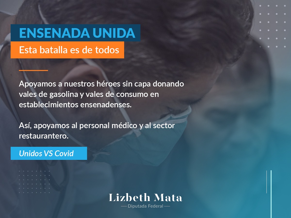 Con la finalidad de rendir un homenaje al personal médico que se encuentra en la primera línea de combate en la contingencia sanitaria COVID-19 y apoyar al comercio y establecimientos de la localidad, la Diputada Federal del Partido Acción Nacional, Lizbeth Mata Lozano, lanza la campaña “Ensenada Unida, Esta Batalla es de Todos”, mediante la cual se busca otorgar alimentos y combustible a los doctores, doctoras, enfermeros y enfermeras.