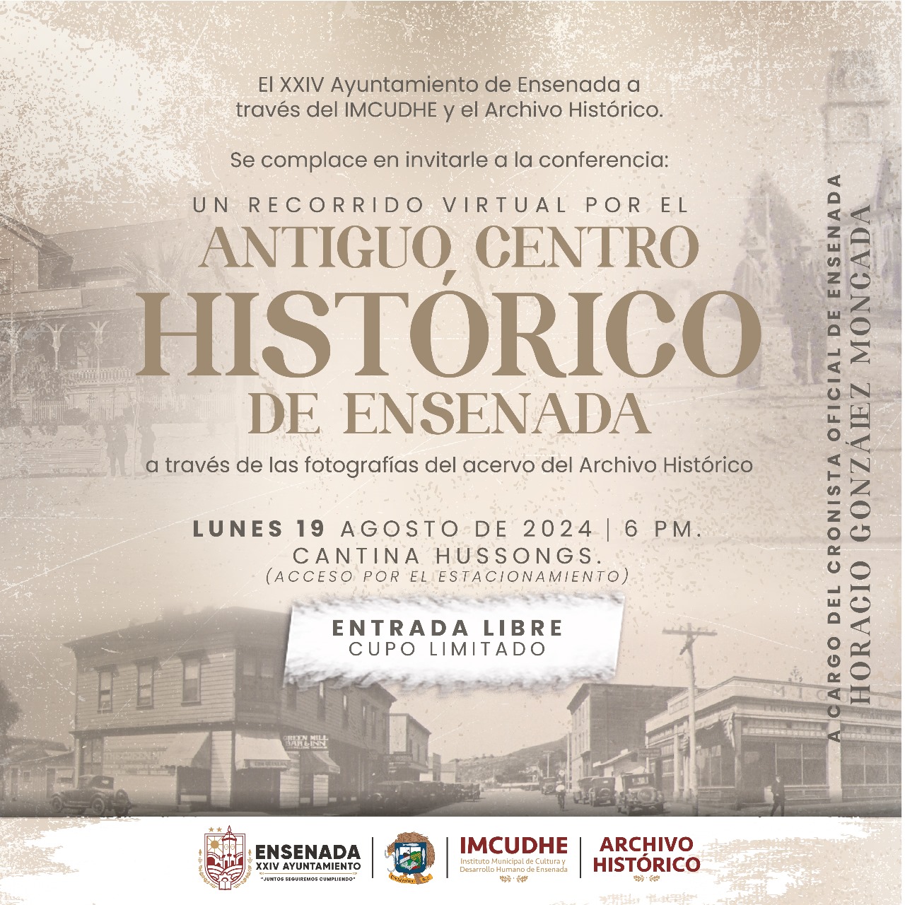 Ensenada, B. C.- Viernes 16 de agosto de 2024.- El Gobierno de Ensenada, mediante el Instituto de Cultura y Desarrollo Humano de Ensenada y el Archivo Histórico, invitan a la conferencia “Un recorrido virtual por el antiguo centro histórico de Ensenada”, el próximo lunes 19 de agosto a las 6:00 de la tarde en la Cantina Hussong’s, de la calle Primera y Ruiz.