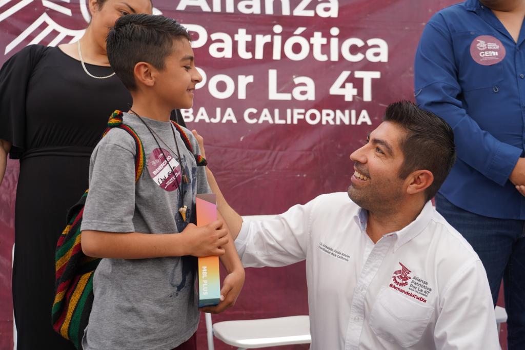Tijuana. – Elías de tan sólo 9 años de edad que cursa el cuarto año de primaria, mostrando en su rostro la alegría y entusiasmo, ya que ayer logró recibir como regalo una tableta con la que asegura, “ahora podré estudiar y realizar mejor mis trabajos escolares”. Esto fue gracias al apoyo de la asociación nacional Alianza Patriótica por la 4T y de un grupo de empresarios que conforman la agrupación también por la 4T que semana a semana apoyan a las familias de las colonias que visitan.