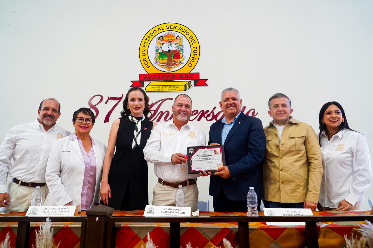 Ensenada, B. C.- Jueves 19 de septiembre de 2024.- Como parte de la Asamblea Solemne del 87 Aniversario del Sindicato de Burócratas de Baja California, el alcalde Carlos Ibarra Aguiar celebró junto al gremio los años de servicio que el personal gubernamental ha cumplido como parte de su carrera laboral en las diferentes dependencias en el Municipio y el Estado.
