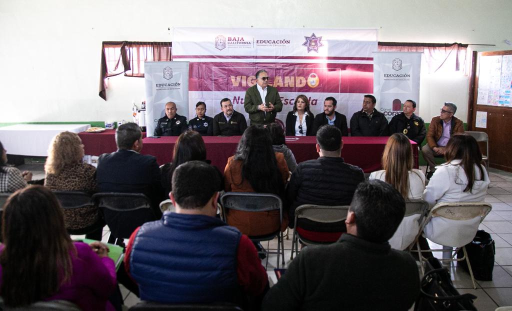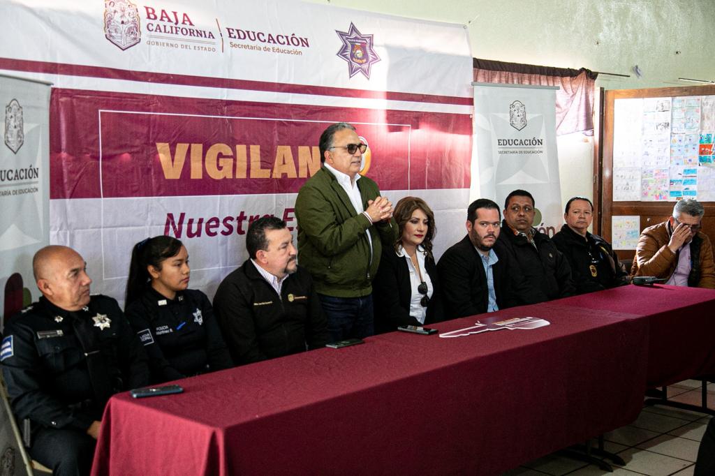 SAN QUINTÍN.- Con la presencia del secretario de Educación del Estado, Mtro. Gerardo Arturo Solís Benavides, y autoridades de seguridad pública, así como inspectores y supervisores de las distintas zonas escolares del municipio de San Quintín, se llevó a cabo el evento “Vigilando nuestra escuela”.