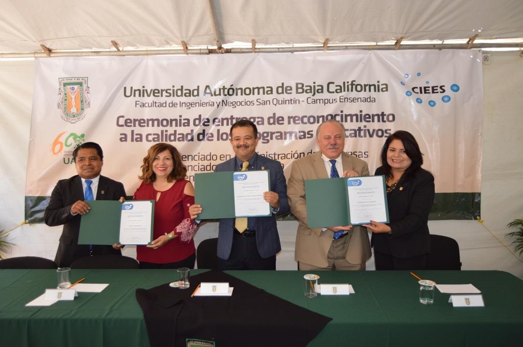 Por su calidad educativa los programas educativos de Licenciatura en Administración de Empresas, Licenciatura en Contaduría e Ingeniero Agrónomo que oferta la Universidad Autónoma de Baja California (UABC) a través de la Facultad de Ingeniería y Negocios San Quintín, recibieron el Reconocimiento Nivel 1 a la Calidad de los programas educativos por los Comités Interinstitucionales para la Evaluación de la Educación Superior A.C. (CIEES).