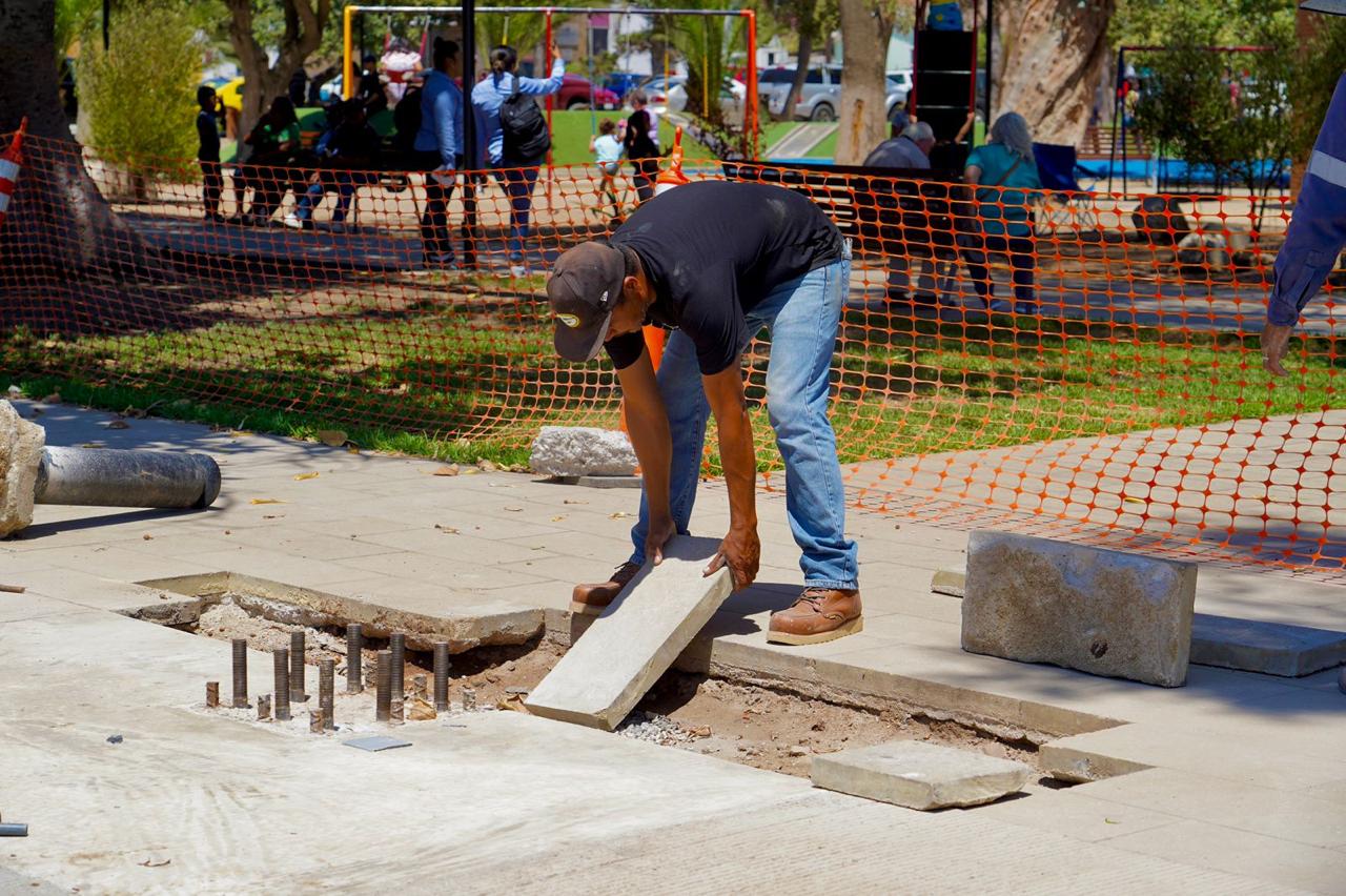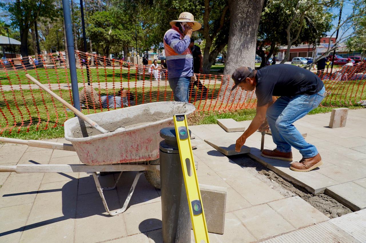 El director de Infraestructura Municipal, Jaime Figueroa Tentori subrayó que las obras de mejoramiento se realizan en armonía con el medio ambiente, y no se están retirando y/o dañando los árboles del parque que colindan con la plaza.