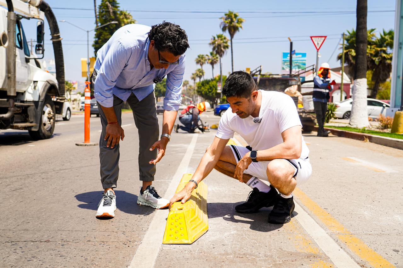 Ensenada B.C.- Sábado 22 de junio de 2024.- Para verificar que la instalación de delimitadores se realice conforme a lo proyectado, el alcalde Armando Ayala Robles supervisó los trabajos en la ciclovía.