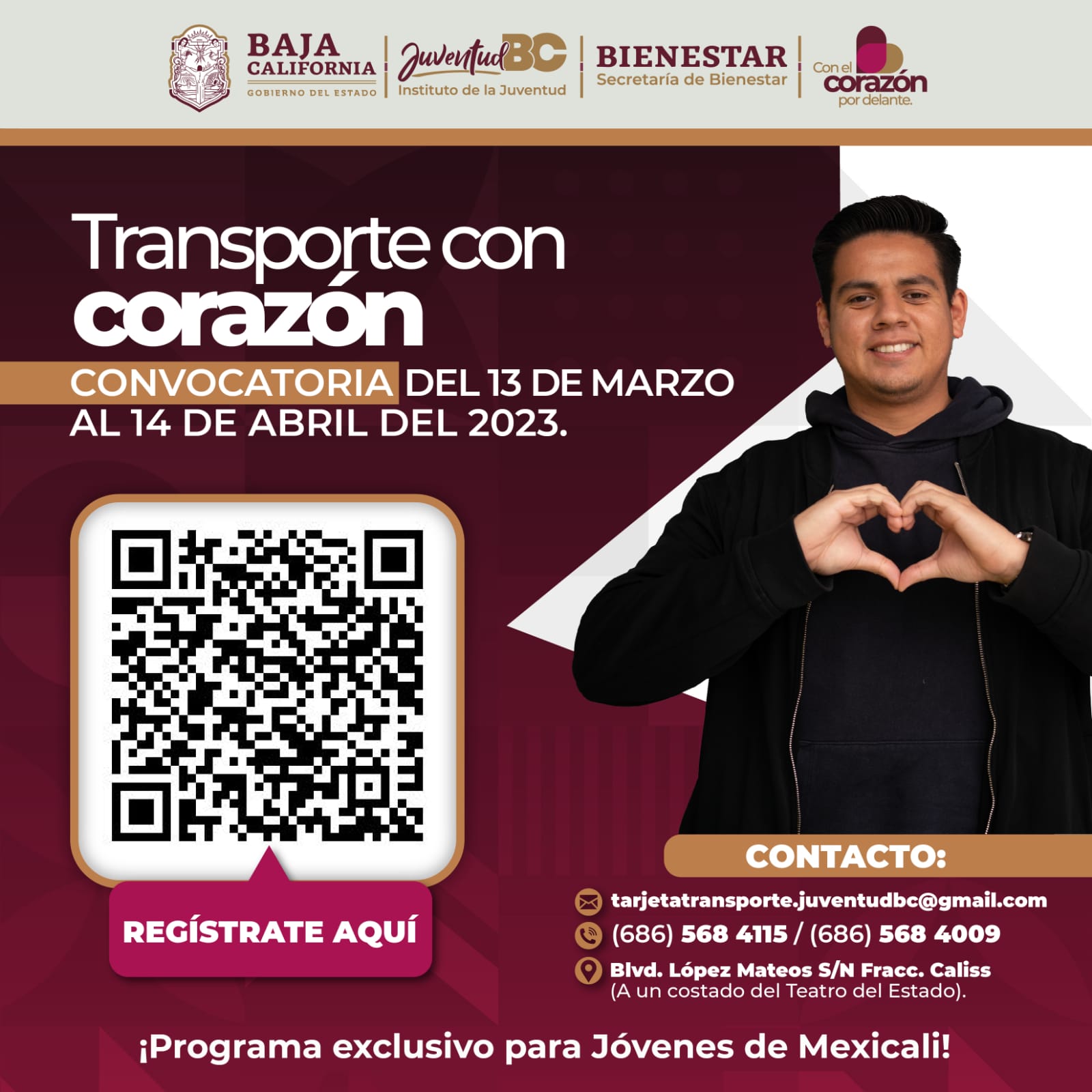 MEXICALI.- De acuerdo al programa de apoyos para el fortalecimiento del gasto familiar establecido por la Administración estatal que encabeza la Gobernadora Marina del Pilar Avila Olmeda, que tiene como propósito impulsar y brindar las herramientas necesarias para que las y los jóvenes continúen sus estudios, el Instituto de la Juventud (Juventud BC) invita a estudiantes de 14 a 29 años a solicitar la Tarjeta de Transporte con Corazón.