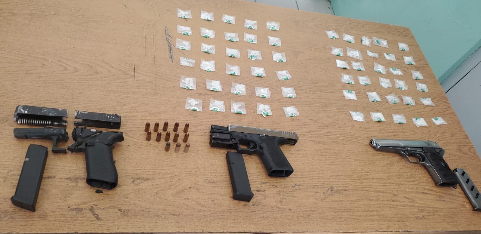 Posteriormente se realizó una inspección y a cada uno de los sospechosos se les encontraron 30 envoltorios con la droga denominada Cristal, además de que se aseguraron tres armas de fuego de calibre 9 milímetros, una de ellas fragmentada en cuatro partes. También se localizaron tres cargadores abastecidos con 25 cartuchos del mismo calibre en total.
