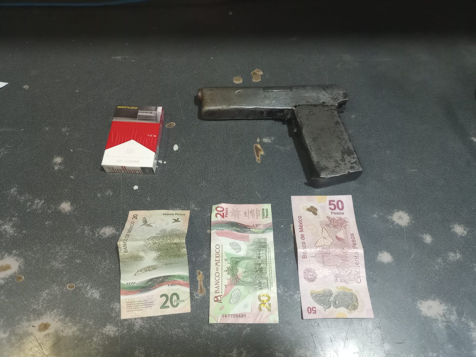 Se trata de Manuel “N”, de 40 años de edad, quien al momento de ser asegurado portaba un arma tipo pistola de utilería cromada, además de traer consigo mismo 90 pesos y una cajetilla de cigarrillos que presuntamente robó minutos antes en una tienda Oxxo ubicada a un costado del parque industrial Las Californias, sobre la calzada Industrial Palaco.