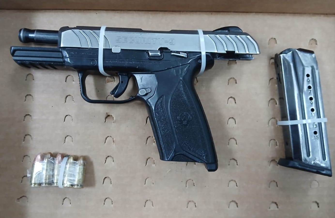 Durante la intervención, oficiales aplicaron una inspección corporal precautoria a los dos sujetos sin encontrarles alguna sustancia u objeto ilegal. Sin embargo, al verificar la motocicleta se logró localizar a prontitud en el manubrio un arma de fuego tipo pistola de la marca Ruger, de calibre 9 milímetros con cuatro cartuchos útiles en el cargador y uno más en la recámara.