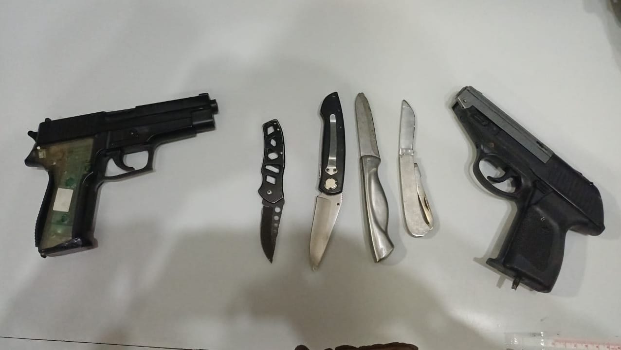 Durante la inspección corporal se les localizó un arma prohibida a cada una de las personas, siendo estas tres navajas y un cuchillo. Posteriormente se aplicó una revisión al interior del vehículo, donde encontraron dos pistolas de de postas de color negro en la parte de la tapicería. Los tres hombres y la mujer fueron detenidos por el delito de portación de arma prohibida.