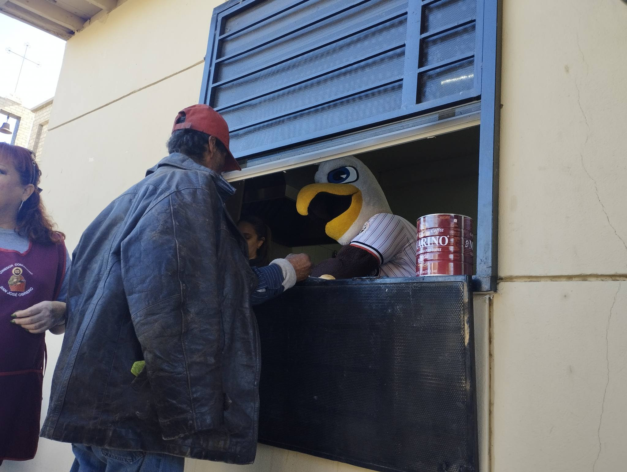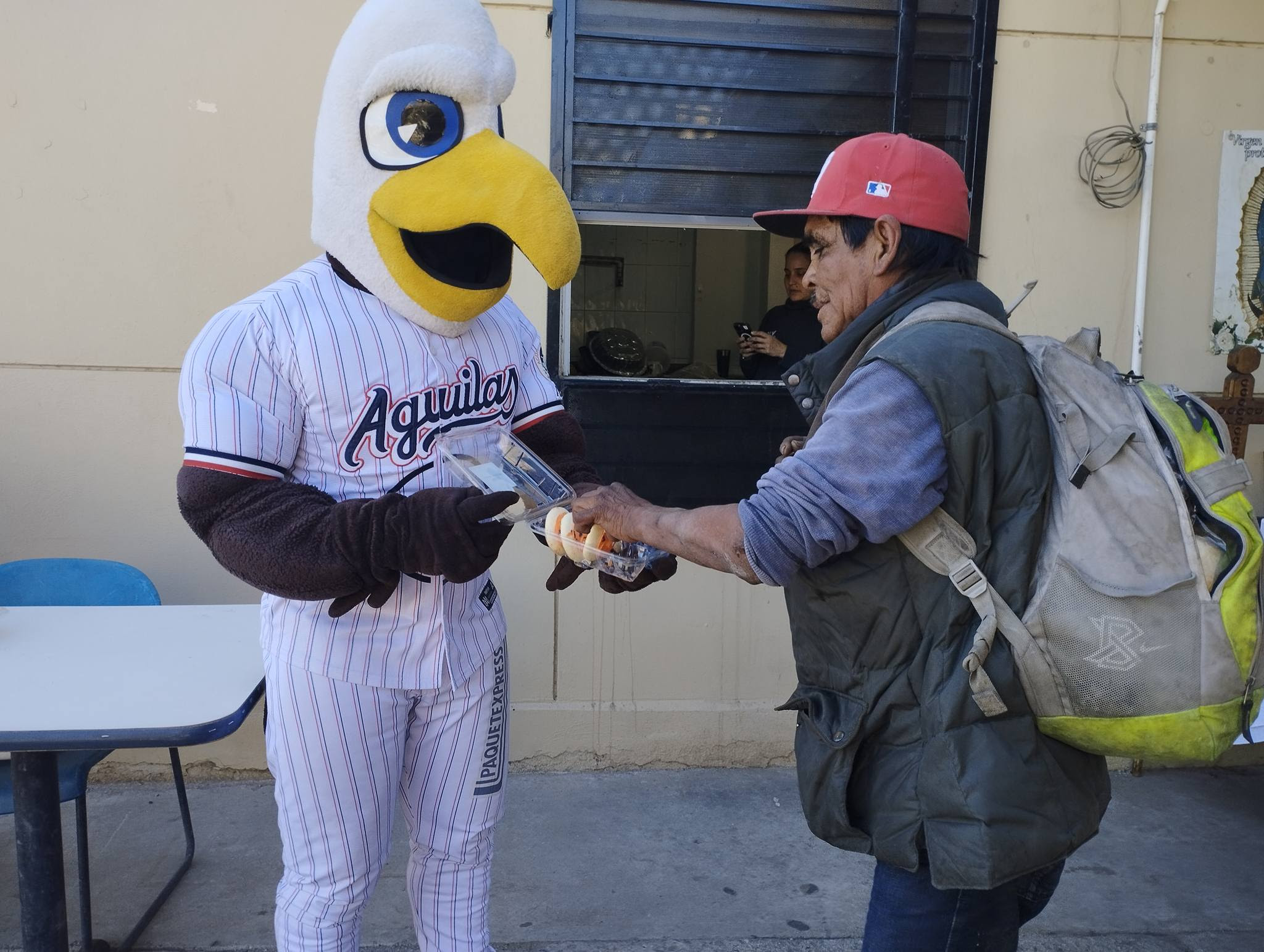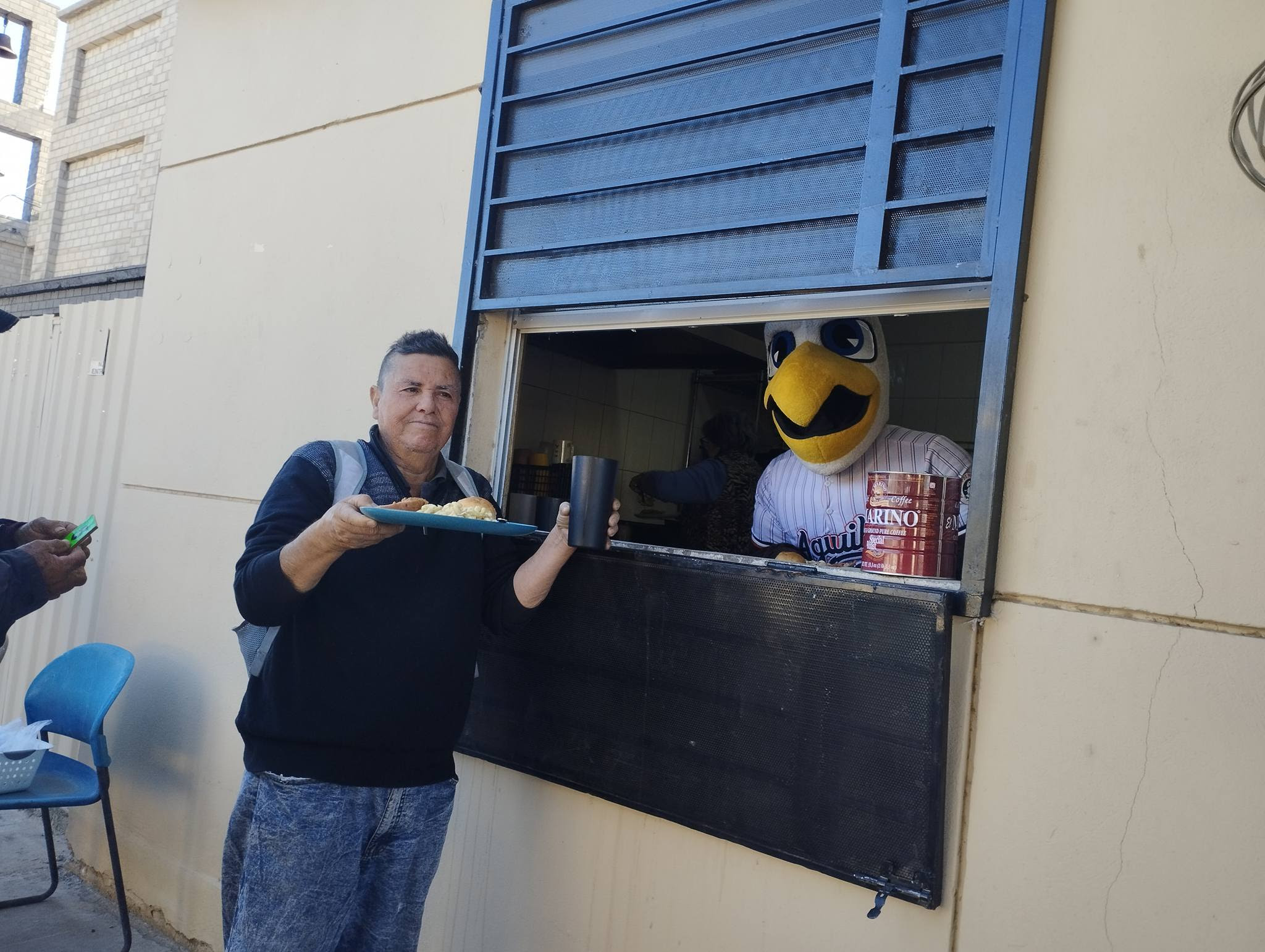 Las actividades comenzaron desde temprana hora, cuando el equipo de Águilas de Mexicali llegó al comedor comunitario en compañía de Lucho el Aguilucho, para compartir un grato momento con los asistentes. Más tarde, Lucho participó en la entrega de los desayunos del día y convivió con los presentes, generando sonrisas y un ambiente de cercanía.