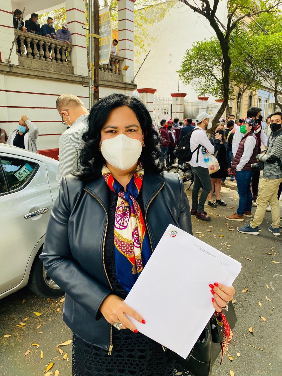 La senadora Alejandra León Gastélum, presentó este día su solicitud de registro para participar en la contienda interna del partido MORENA para elegir candidata o candidato a la gubernatura estatal de Baja California.