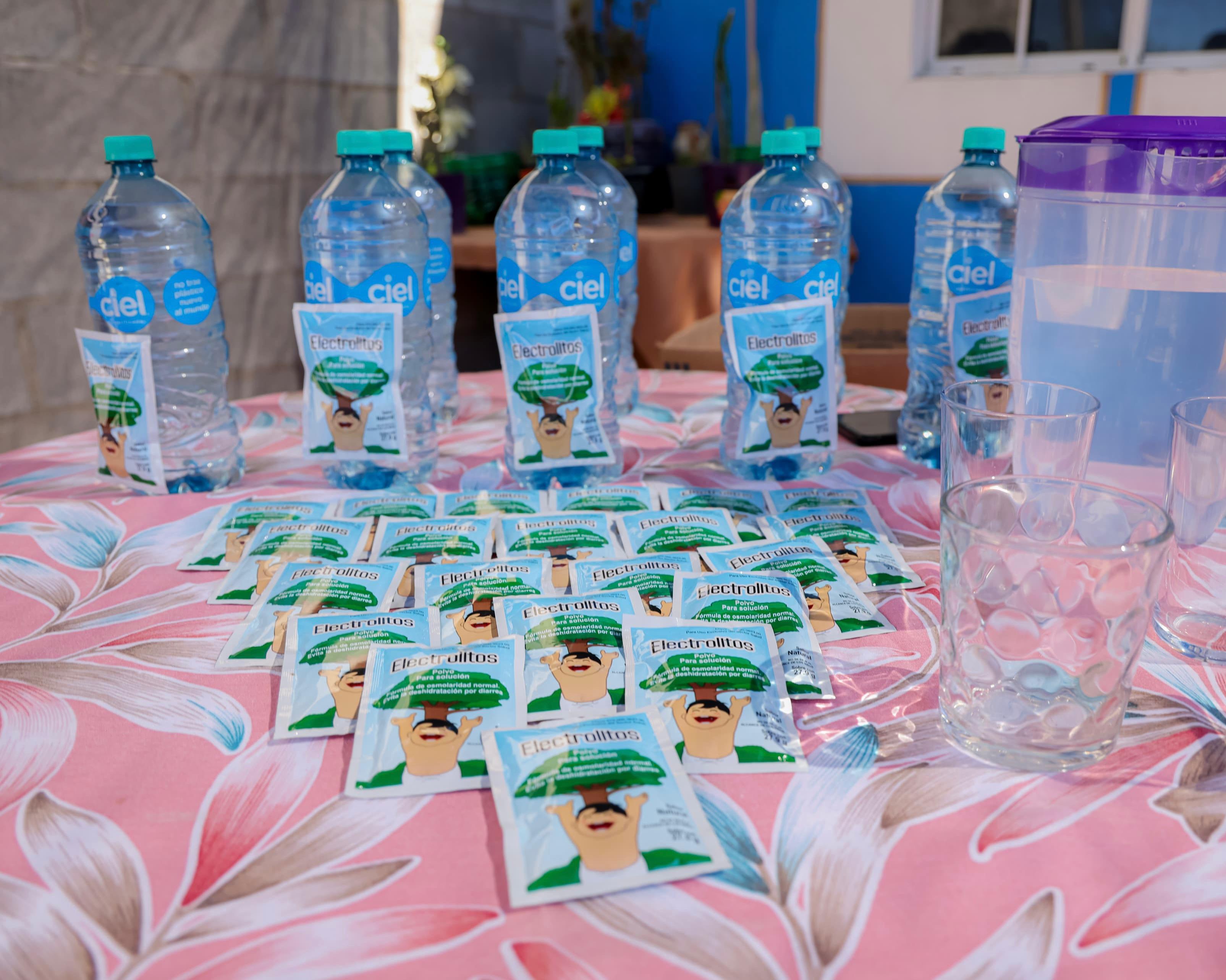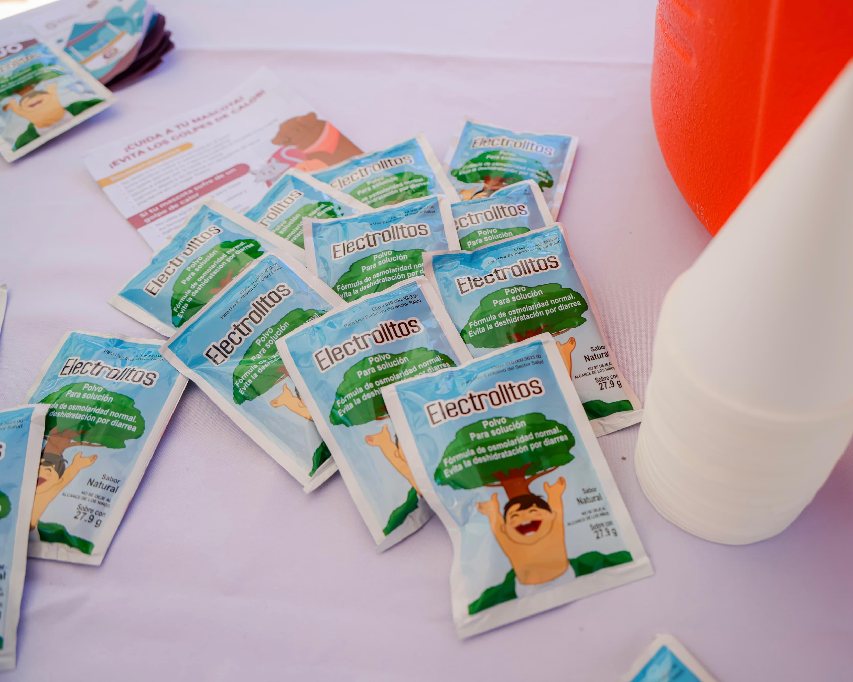 En este recorrido, la mandataria observó las acciones que se realizan mediante esta estrategia, en la que participan líderes de salud comunitaria orientando a la ciudadanía sobre la detección temprana de síntomas de deshidratación y prevenir golpes de calor, además de proporcionar a las personas kits de agua y suero oral para preparar en casa y soluciones ya listas para quienes lo necesiten al momento.