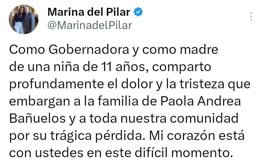 “Como gobernadora y como madre de una niña de 11 años, comparto profundamente el dolor y la tristeza que embargan a la familia y a nuestra comunidad por la trágica pérdida de Paola Andrea Bañuelos. Mi corazón está con ustedes en este difícil momento”, manifestó.