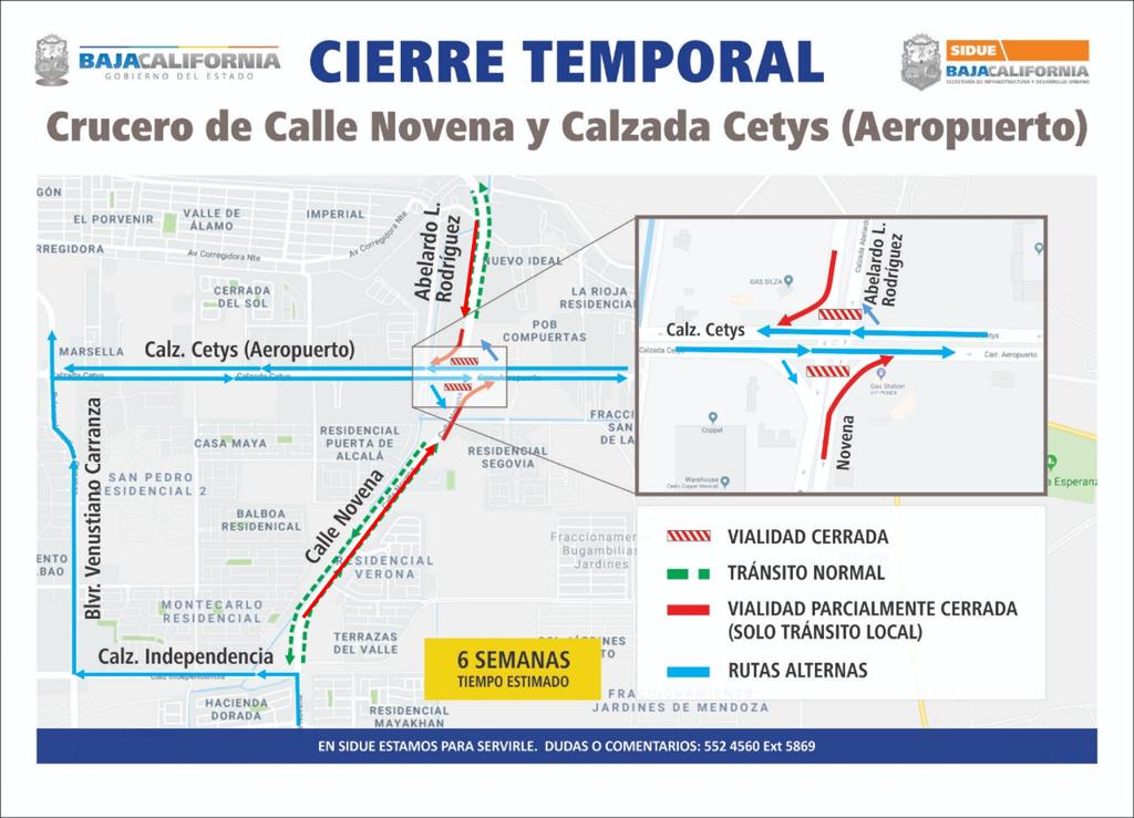 Los que circulan por el bulevar Abelardo L. Rodríguez hacia el sur en la zona del crucero, solo habrá tráfico local y vuelta a la derecha para incorporarse a la calzada Cetys hacia el poniente, y los que circulan hacia el norte por la calle Novena, también solo habrá tráfico local y vuelta a la derecha para trasladarse hacia el oriente o al aeropuerto; dichos trabajos tendrán un lapso aproximado de seis semanas, por lo que se invita a la ciudadanía a que tome sus precauciones y anticipe sus traslados.