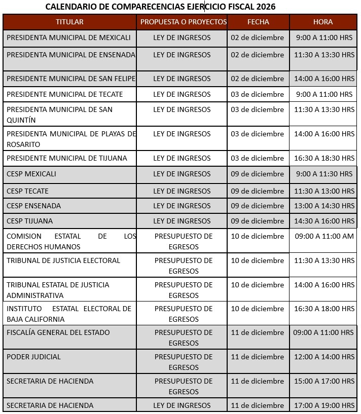 • Se realizarán del 2 al 11 de diciembre; inician con el análisis de la Ley de Ingresos de Mexicali y concluyen con el de ingresos y egresos de la Secretaría de Hacienda