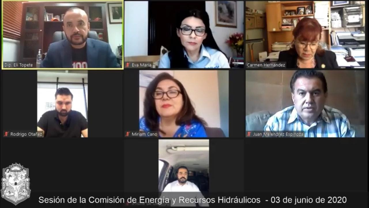 Durante la sesión virtual de la Comisión de Energía y Recursos Hidráulicos estuvieron presentes sus diputados integrantes Elí Topete Robles, presidente; Carmen Leticia Hernández Carmona, secretaria, y los vocales Gerardo López Montes, Miriam Elizabeth Cano Núñez, Rodrigo Aníbal Otáñez Licona y Juan Meléndrez Espinoza. Además, estuvo en la sesión la inicialista diputada Eva María Vázquez.