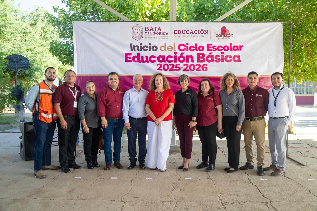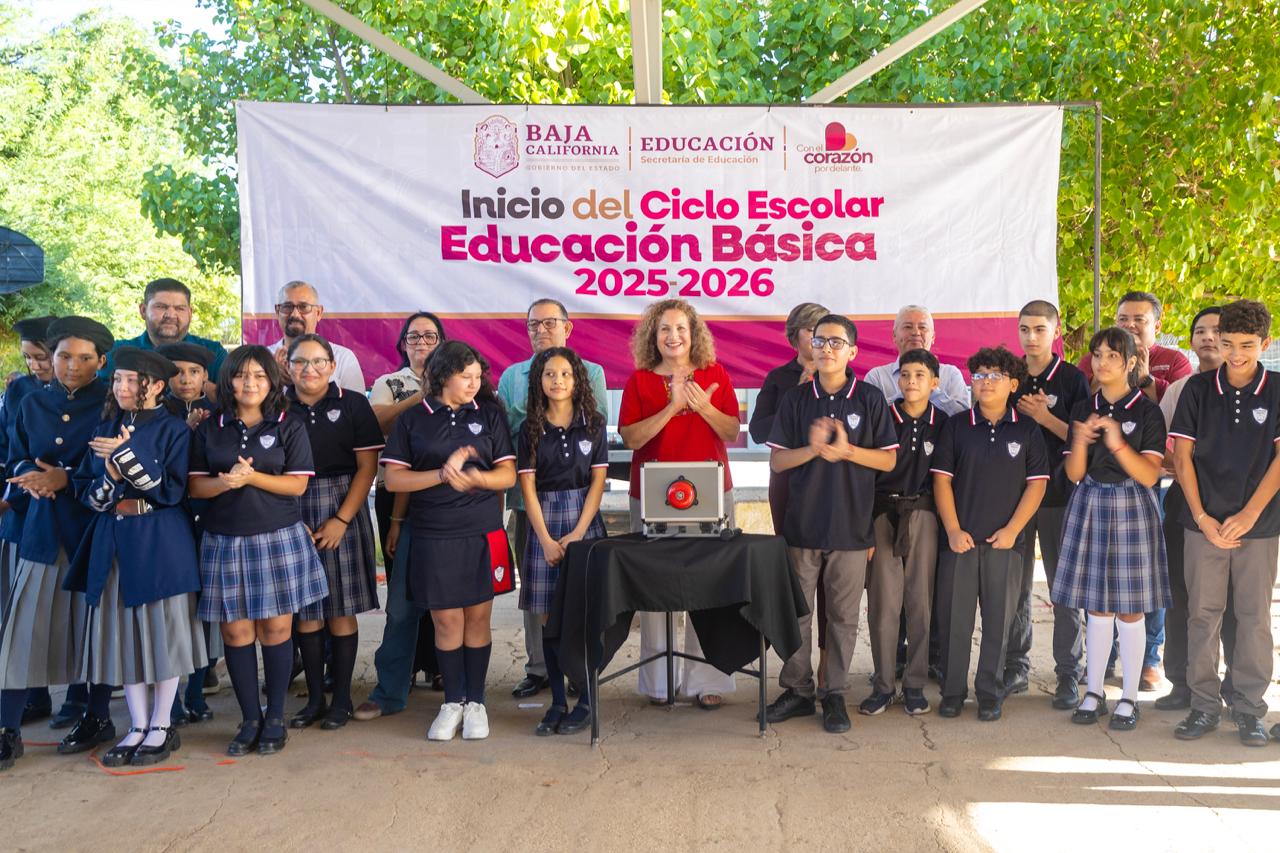 MEXICALI. Con la representación de la Gobernadora del Estado, Marina del Pilar Avila Olmeda, la secretaria de Educación, Irma Martínez Manríquez presidió las ceremonias de arranque de ciclo escolar 2025-2026 en educación básica y del semestre escolar 2025-2 en media superior en Baja California, realizadas en la secundaria Técnica No. 8 y Cetis 18, respectivamente, en el municipio de Mexicali.