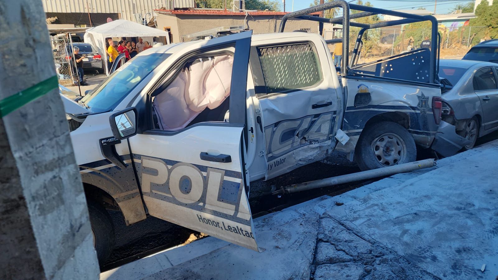 Es así como inició una persecución a la que se sumaron agentes de la FESC y posteriormente de AEI, extendiéndose hasta la colonia Constitución en donde el hombre embistió a dos oficiales que a bordo de una patrulla trataron de impedirle el paso, pero el sujeto no respetó la señal de alto de disco ni redujo su velocidad causando que la patrulla impactara con otros dos automóviles estacionados en la calle Joaquín Herrera.