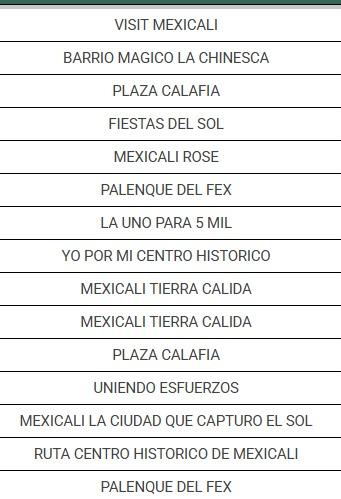 Informó que entre las marcas registradas se encuentran nombres emblemáticos como Fiestas de Sol, Plaza Calafia, Palenque del FEX, Barrio Mágico La Chinesca, Ruta Centro Histórico de Mexicali, Mexi Cali Tierra Cálida, Visit Mexicali, Mexicali la Ciudad que Capturó el Sol, Yo por mi Centro Histórico, Uniendo Esfuerzos y La Uno para 5 Mil, entre otras.