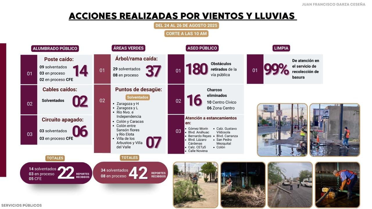 Por su parte, Francisco Garza Ceseña, titular de Servicios Públicos, informó que desde el domingo, cuando se presentó la primera tormenta, el personal de la dependencia se ha dedicado a atender los diversos reportes, los cuales se han clasificado de la siguiente manera:
