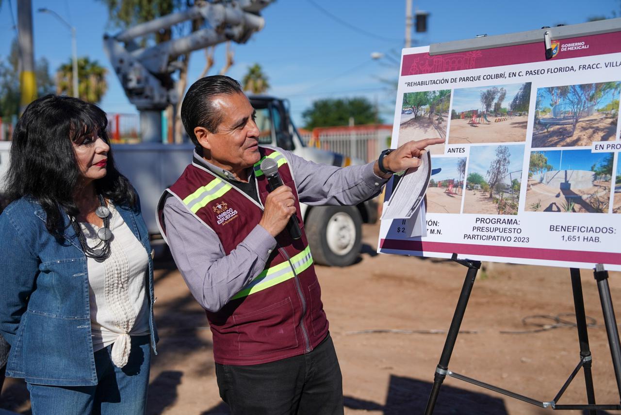Mexicali B.C. A 22 de noviembre 2023.- Al fin es una realidad para las familias del fraccionamiento de Villa Florida la rehabilitación del parque “El Colibrí”, después de años solicitando esta renovación la presidenta municipal Norma Bustamante acudió el día de hoy a supervisar el avance de esta obra.
