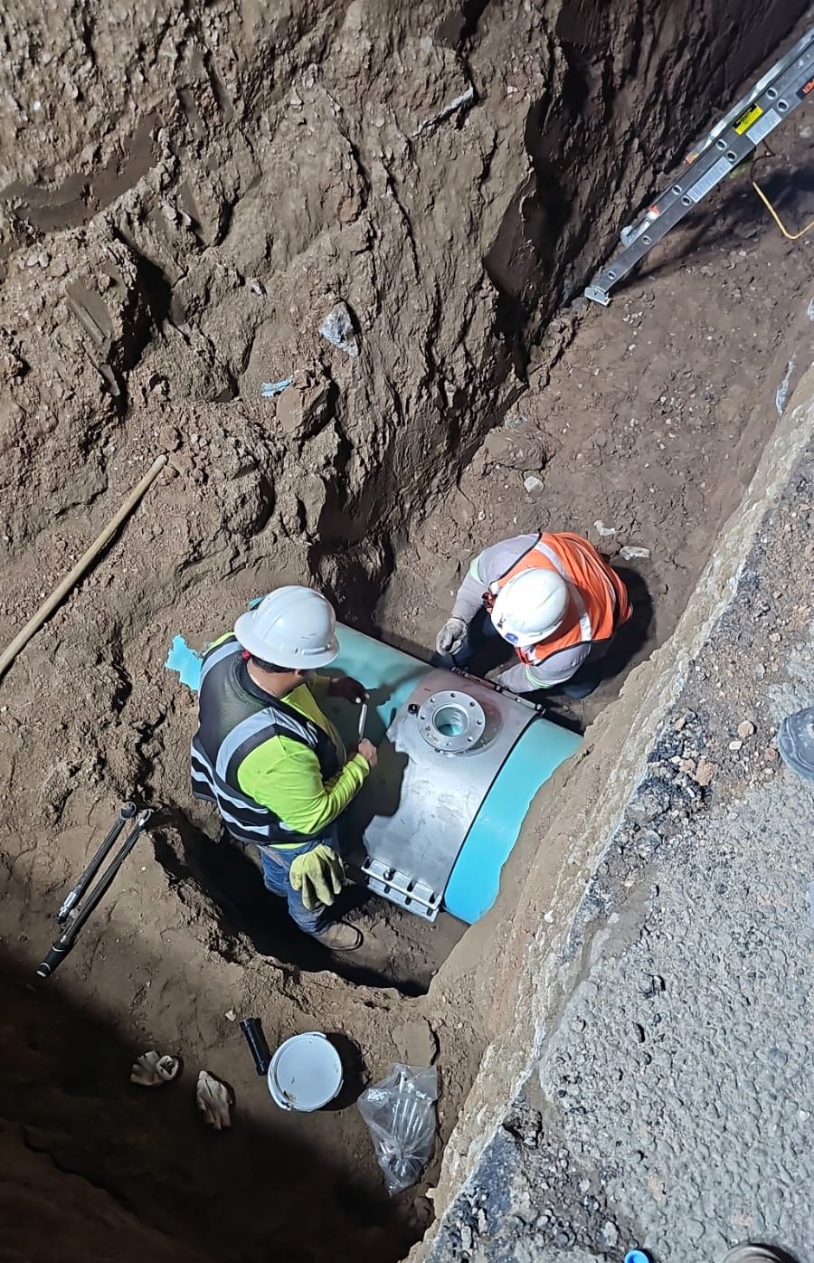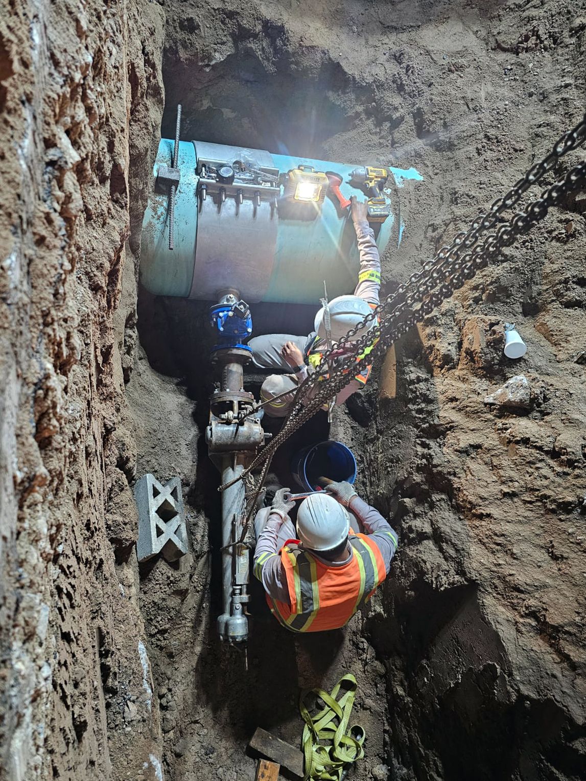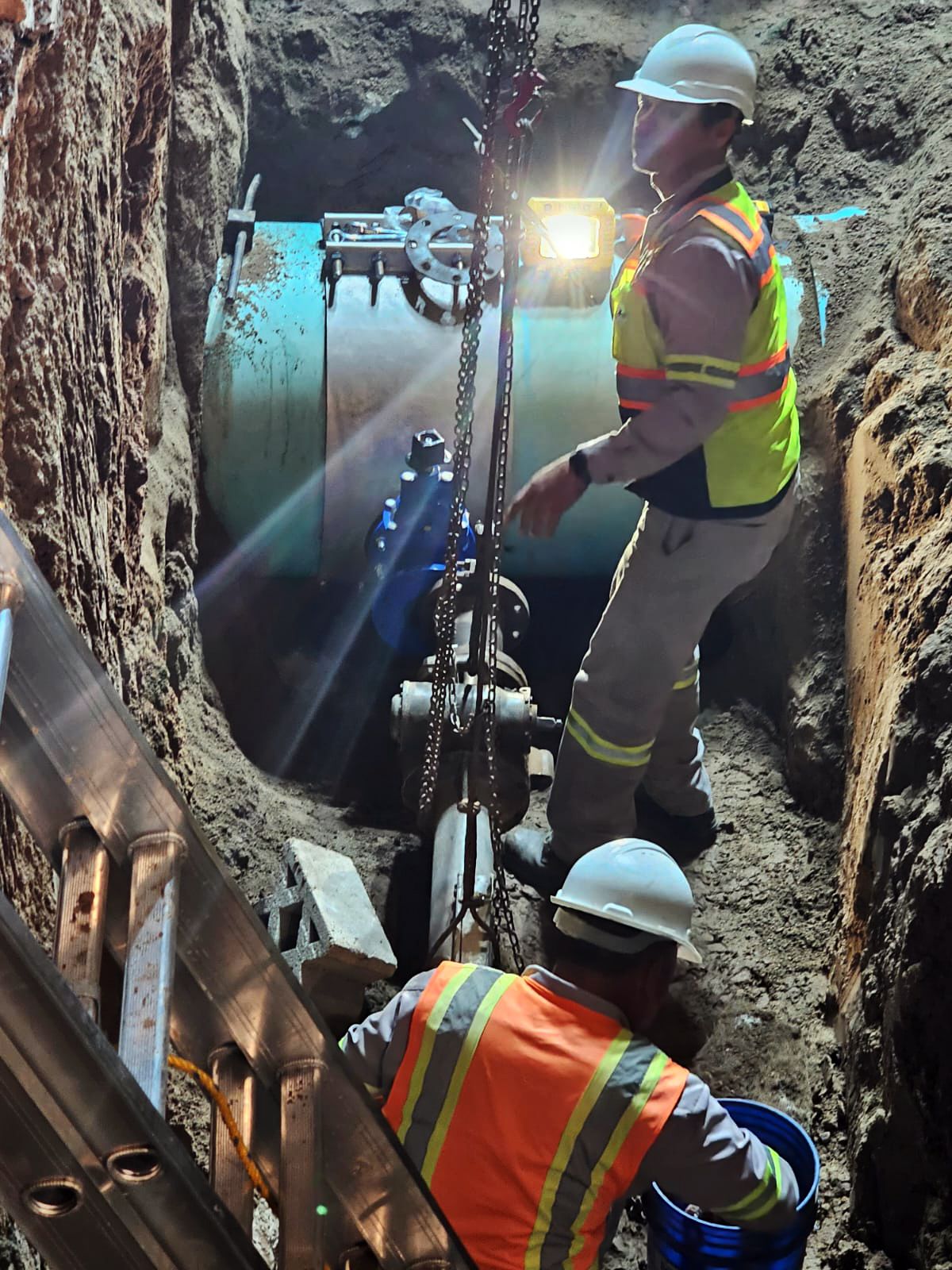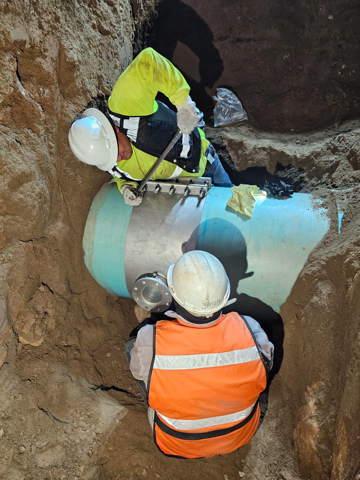 Las acciones principales consistieron en la instalación de tubería de 20 pulgadas para agua potable, así como la colocación de un tapping sleeve de 30” x 4”, equipo que permitirá realizar conexiones a la red existente sin interrumpir completamente el suministro.