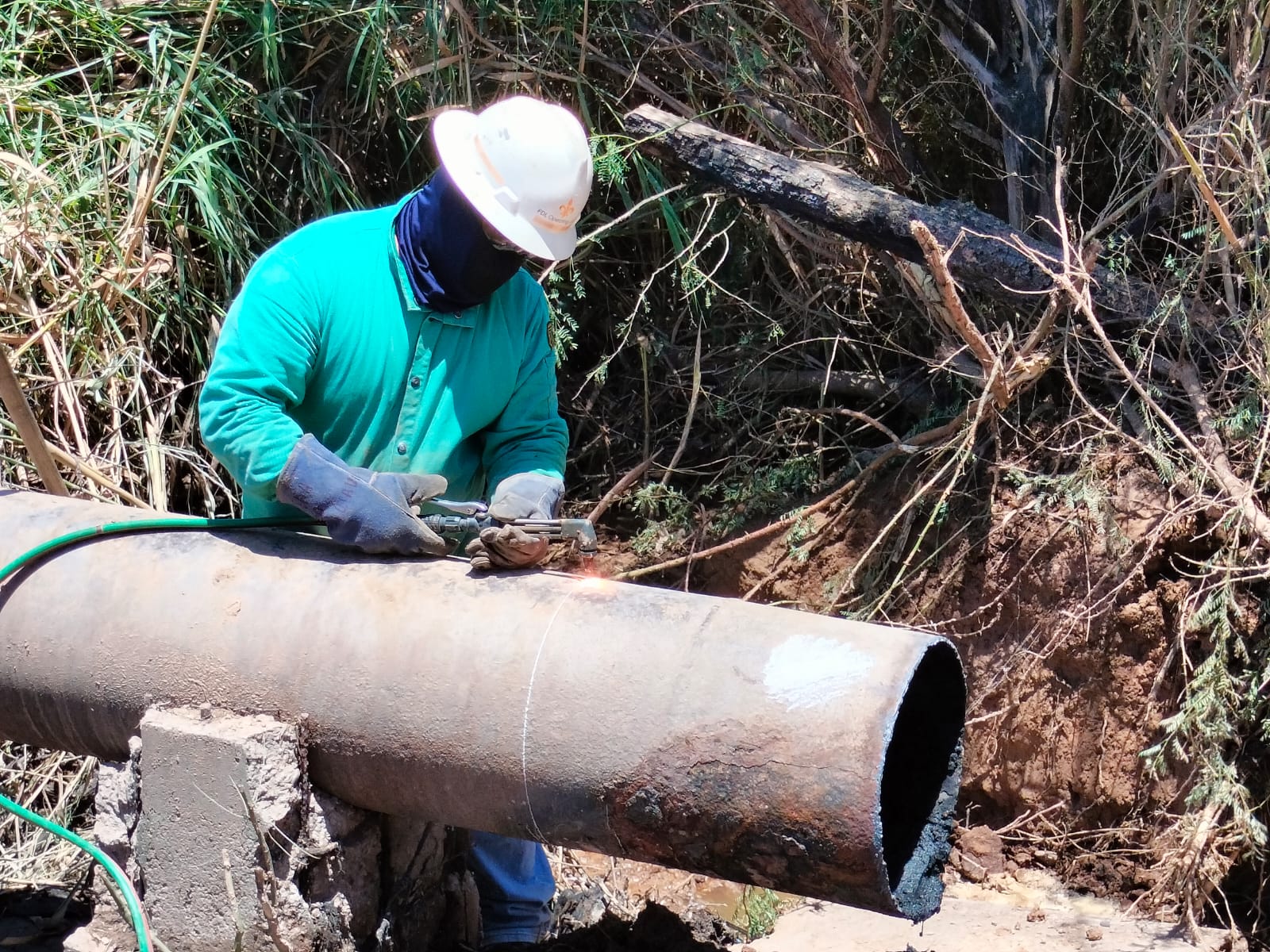 Adicionalmente, el equipo de Potabilización apoyó regulando la presión en la red de agua potable del poblado para asegurar que los trabajos se realizaran sin complicaciones adicionales. Personal de Redes de la zona 8 también contribuyó retirando una línea de agua potable adyacente al emisor y la instalación de una motobomba de 4 pulgadas en un pozo de visita sanitario, con el fin de evitar derrames de aguas negras en las calles.