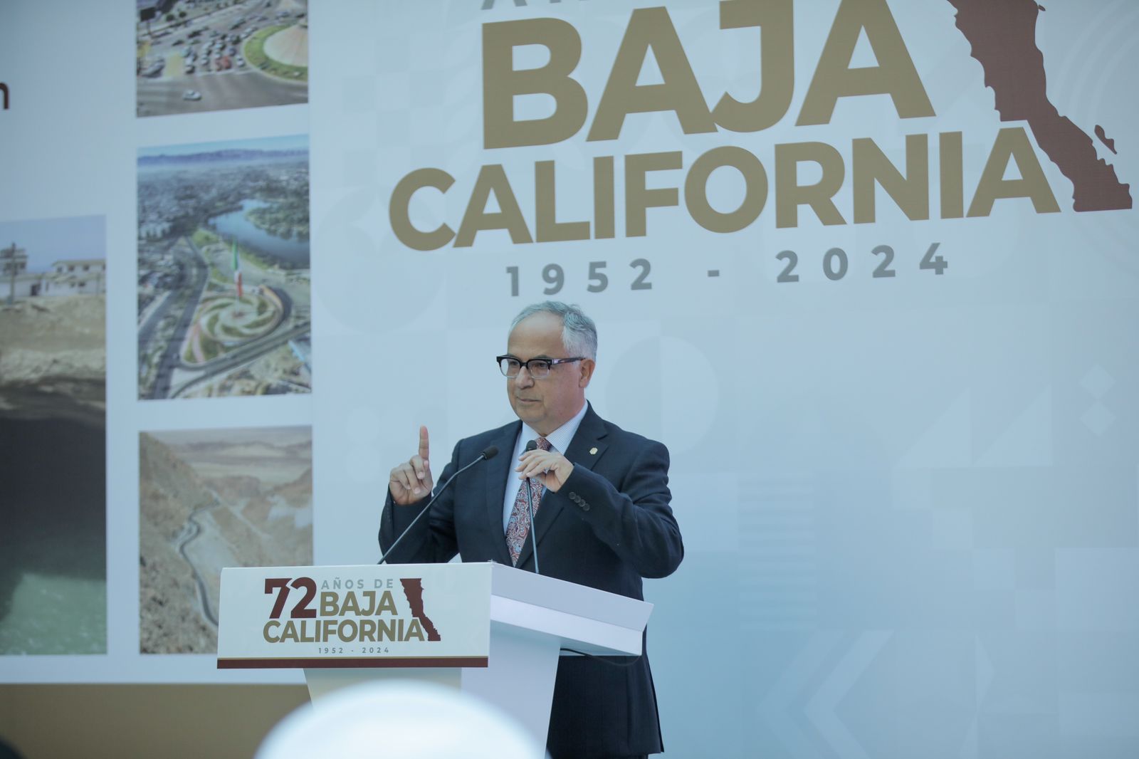 MEXICALI.- En representación de la gobernadora Marina del Pilar Avila Olmeda, el secretario general de Gobierno, Alfredo Álvarez Cárdenas, encabezó la ceremonia de conmemoración del 72 Aniversario de Baja California, en las instalaciones del edificio de la Rectoría de la Universidad Autónoma de Baja California (UABC) en la ciudad de Mexicali, patrimonio cultural de la entidad.