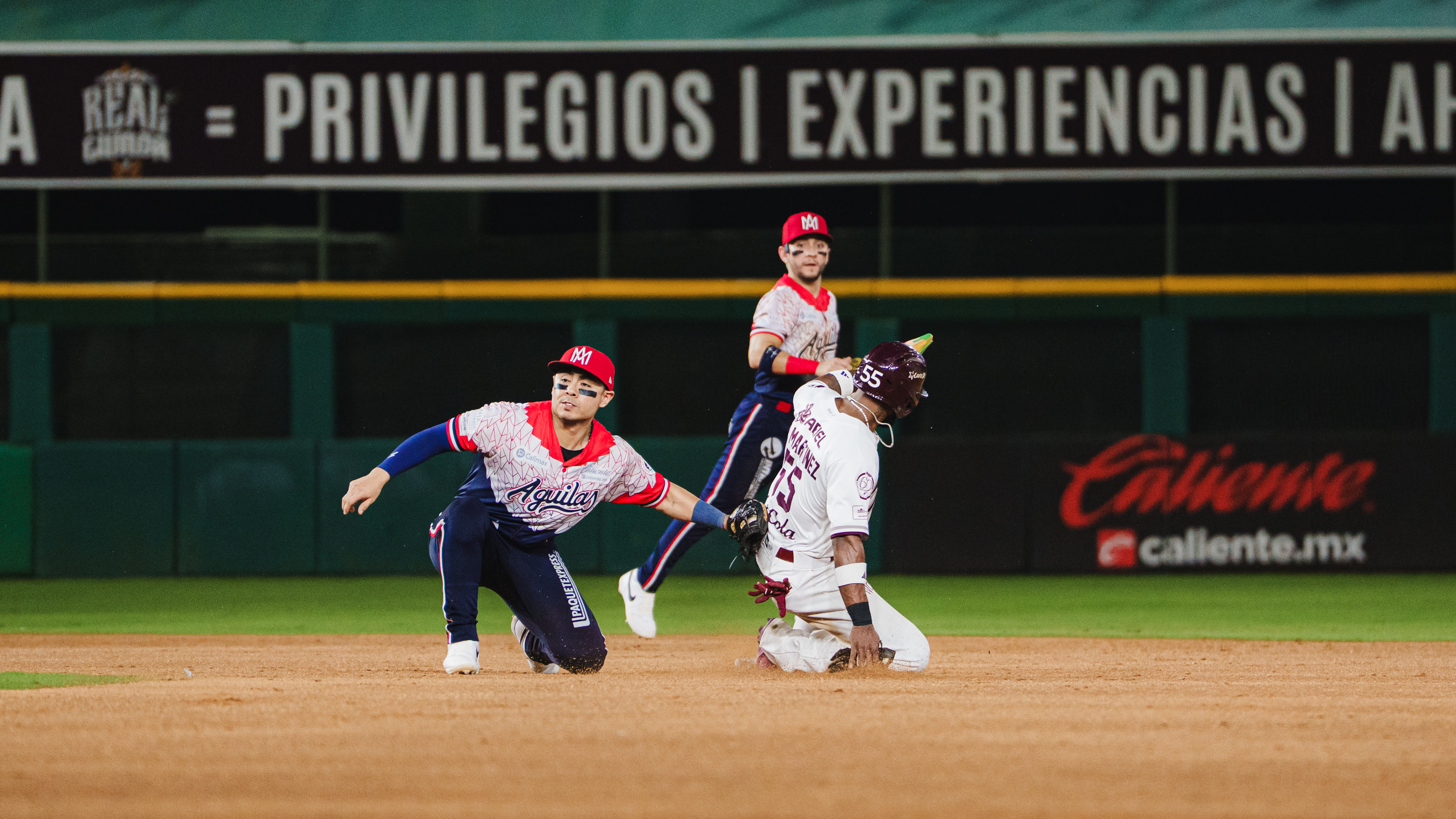Mexicali, B.C., 25 de diciembre de 2025. Estadio Tomateros. Rally de 3 carreras en la séptima entrada y 2 más en la novena, fueron claves con el que Los Águilas de Mexicali derrotaron 10 carreras a 5 a Tomateros de Culiacán en el inicio de la última serie como visitante de la temporada 2025-2026 de la Liga ARCO Mexicana del Pacífico, presentada por Caliente.mx.