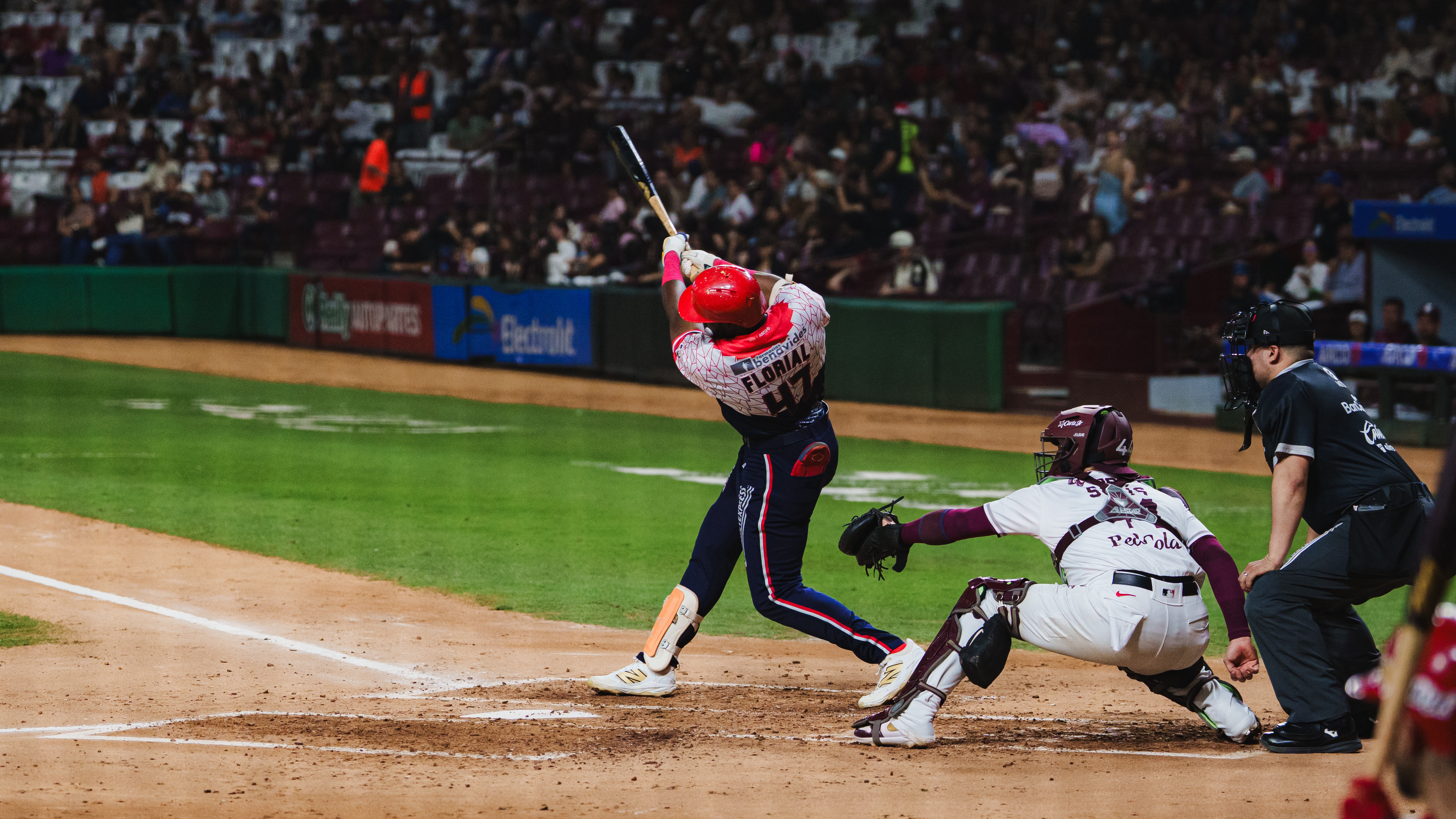 Los Águilas de Mexicali mostraron su ofensiva en la primera entrada, Estevan Florial sacó la bola por el jardín derecho en el primer lanzamiento del juego para su sexto cuadrangular de la temporada para un movimiento tempranero en el score 1 carrera por 0.