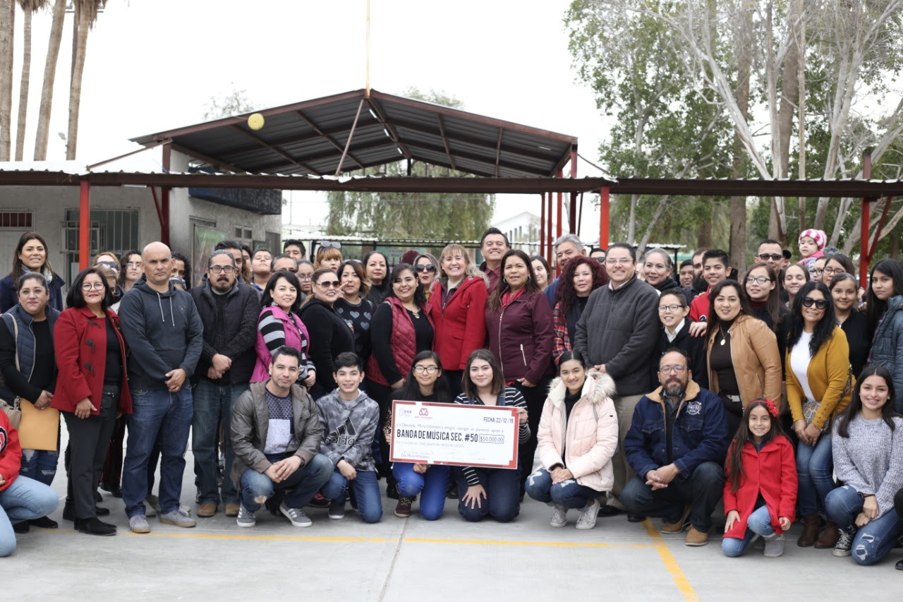 Fue la congresista Mary Villalobos Ávila, quien en conjunto con diputados de la Bancada de Morena otorgó el cheque al director de la banda de música, Gerson Ramírez y a la sra. Ana Alvarado, quien en representación de los padres de familia recibieron un cheque por un monto recabado de 55 mil pesos.