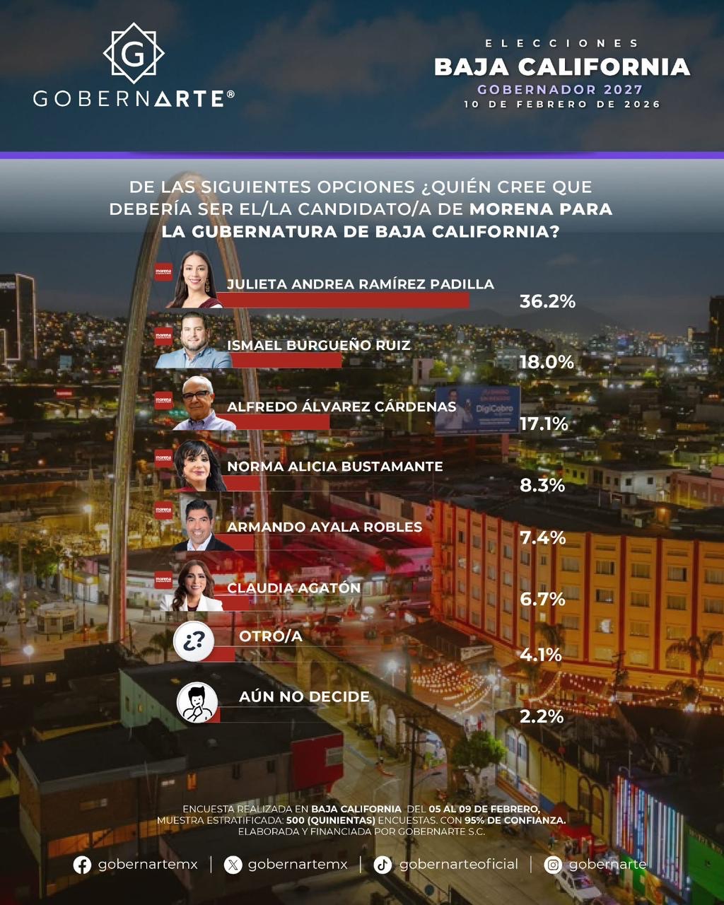 La joven morenista, de acuerdo a la medición, cuenta con el 36.2 por ciento de las preferencias, sobre un lejano 18 por ciento del alcalde de Tijuana, Ismael Burgueño, y 17.1 por ciento del actual secretario general de Gobierno del Estado, Alfredo Álvarez Cárdenas.