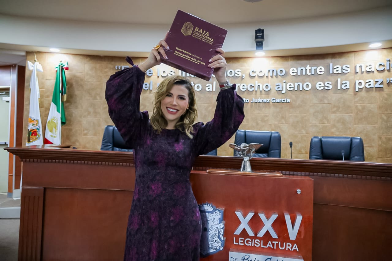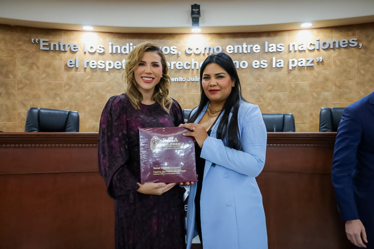MEXICALI.- En cumplimiento de sus funciones como gobernadora constitucional de Baja California, Marina del Pilar Avila Olmeda entregó su tercer informe de actividades ante los diputados de la XXV Legislatura del Congreso del Estado, acompañada por el secretario general de Gobierno, Alfredo Álvarez Cárdenas.