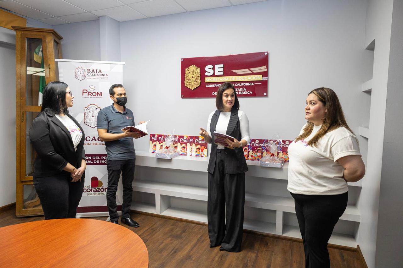 MEXICALI, B.C. Con el propósito de fortalecer la enseñanza del idioma inglés en los niveles de Educación Básica, la Secretaría de Educación, a través del Programa Nacional de Inglés (PRONI), llevó a cabo la entrega de los cuadernillos de trabajo de inglés para alumnas y alumnos de Preescolar y Primaria en el Estado.