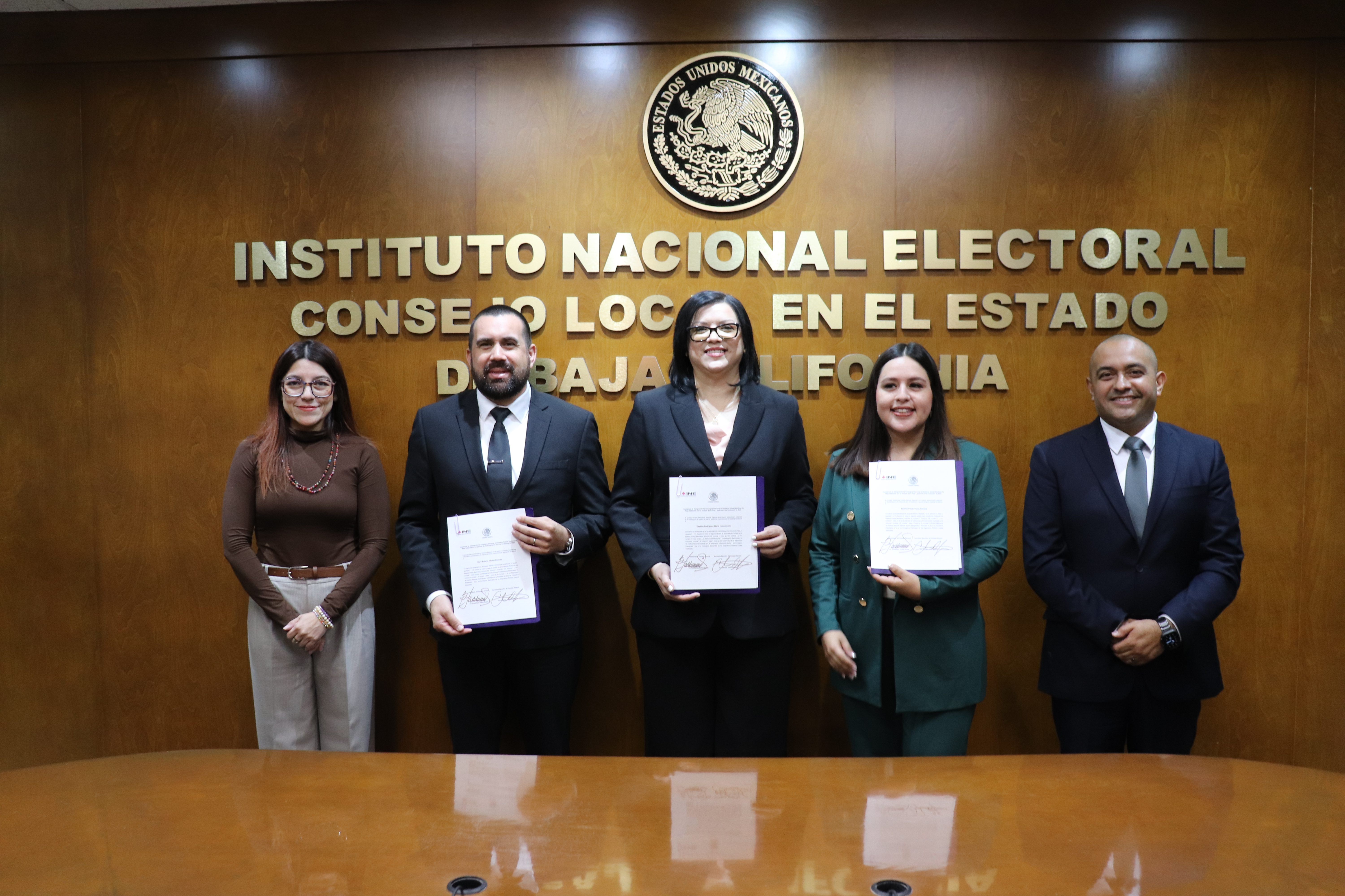La entrega se llevó a cabo en la Sala de Sesiones de la Junta Local Ejecutiva, con la presencia de las y los Vocales Locales del INE BC: María Magdalena Pérez Ortiz, Vocal Secretaria; Vocal de Capacitación Electoral y Educación Cívica; Marco Antonio Cruz Izalde, Vocal del Registro Federal de Electores; y Juan Alejandro Ramírez Hernández, Vocal de Organización Electoral.