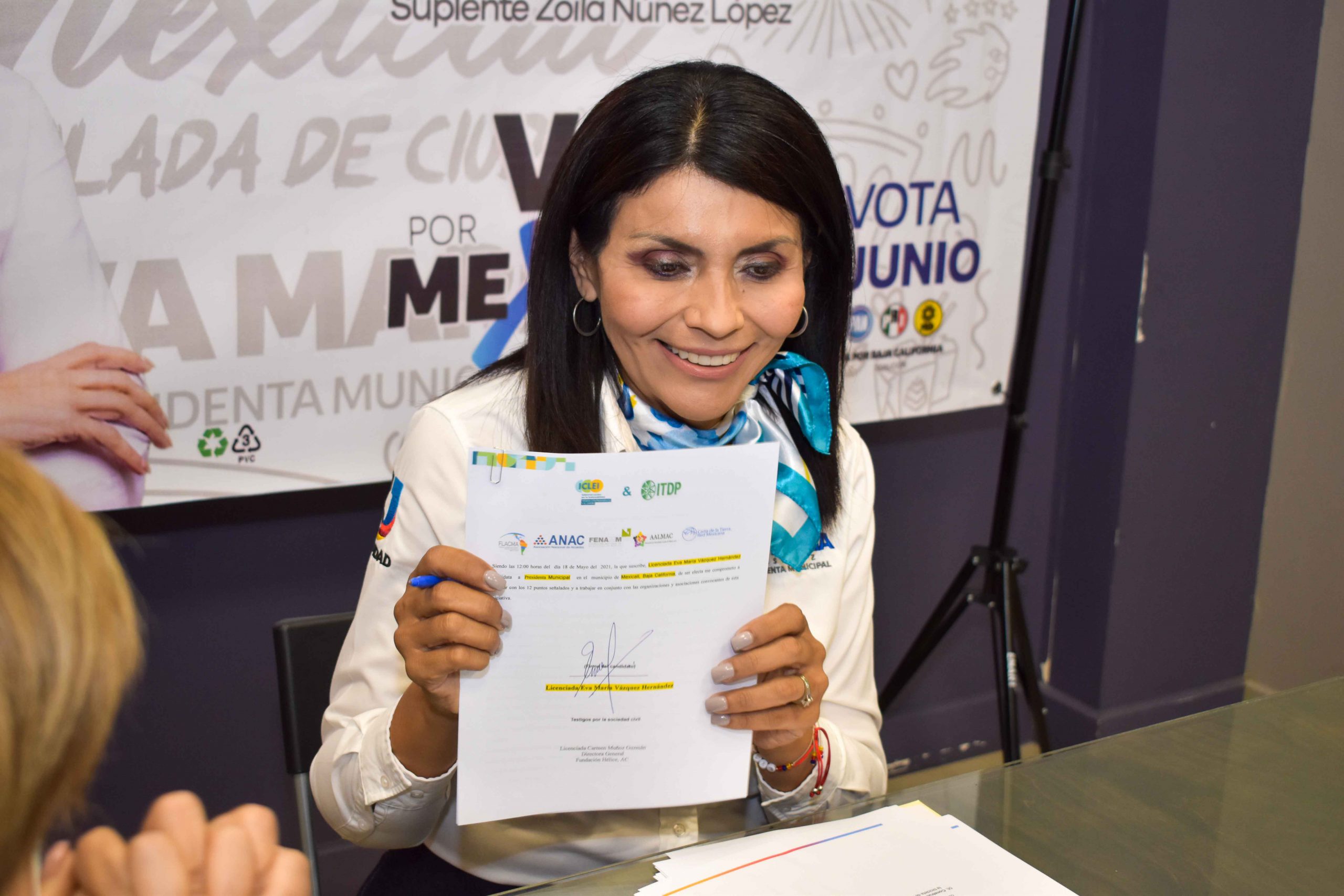 En reunión mixta, tanto presencial como vía digital, Eva María Vásquez Hernández, candidata de coalición Va X Baja California Alcaldía de Mexicali, firmó dos convenios de compromisos en materia ambiental ante representantes de organizaciones internacionales y locales, Compromiso por el Desarrollo Sustentable y la Acción Climática con la fundación ICLEI y el Plan de Manejo de Residuos de Propaganda Electoral 2021 con HÉLICE.