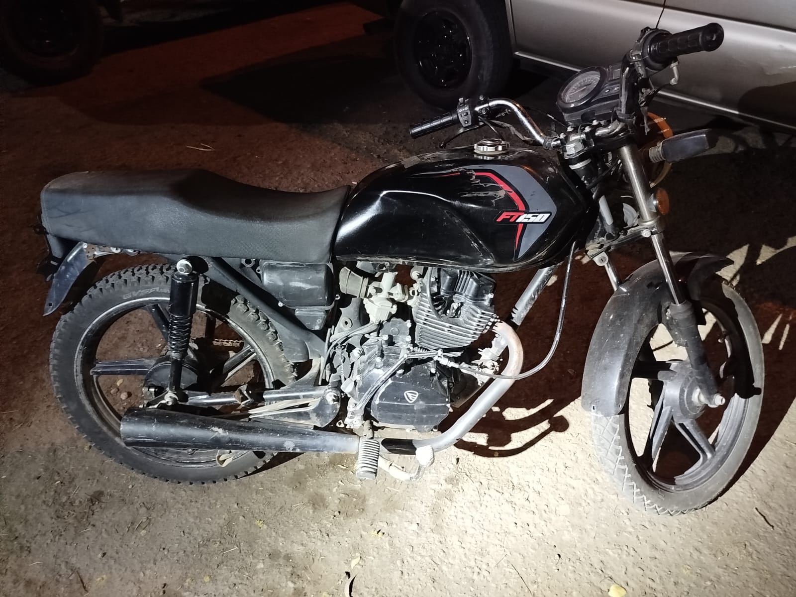 Elementos policiacos interceptaron una motocicleta Italika FT150 de color negro, modelo 2024, para llevar a cabo la intervención correspondiente. Al verificar el número de serie con la central de radio C5, se informó que dicho vehículo contaba con reporte de robo.