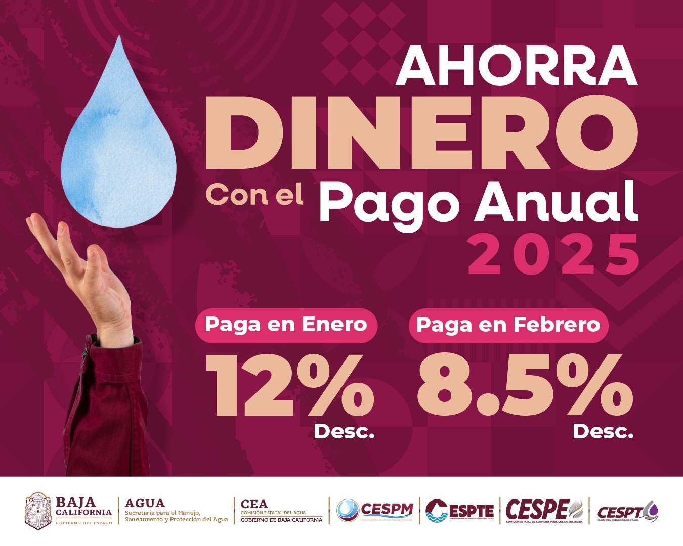 MEXICALI.- A partir de enero de 2026, se pondrá en marcha el esquema de pago anticipado del servicio de agua potable, una medida impulsada por el Gobierno del Estado, encabezado por Marina del Pilar Avila Olmeda, con el fin de aliviar el gasto familiar y fortalecer la prestación de los servicios públicos en los municipios.