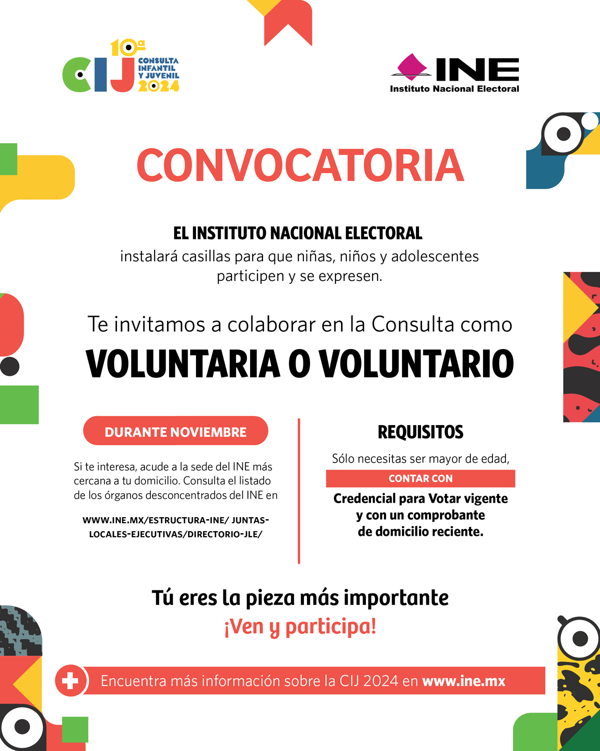 El Instituto Nacional Electoral en Baja California (INE BC), invita a la ciudadanía mayor de edad a participar como Voluntaria en la Consulta Infantil y Juvenil 2024 (CIJ2024).