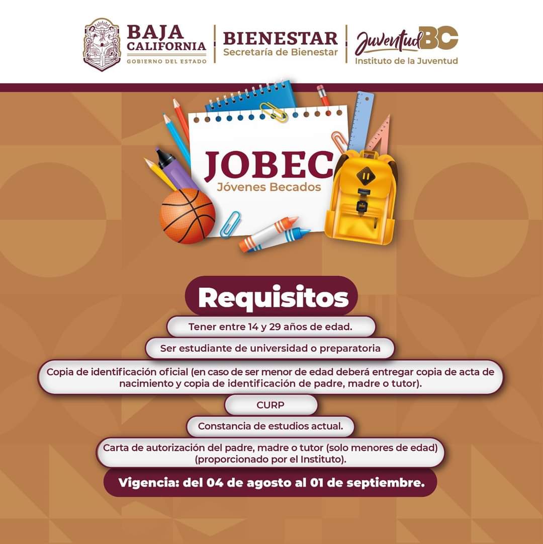 MEXICALI.– Como parte de las acciones encaminadas a apoyar la educación y brindar más oportunidades a las y los estudiantes, el Instituto de la Juventud del Estado (Juventud BC) invita a las juventudes en Baja California que tienen entre 14 y 29 años de edad a participar en la convocatoria “Jóvenes Becados JOBEC”.
