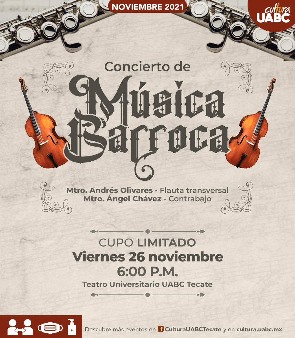 El Concierto de Música Barroca, por los maestros Andrés Olivares y Ángel Chávez se aproxima para deleitar al público con interpretaciones en flauta transversal y contrabajo en un viaje por los clásicos de la música. Se llevará a cabo el 26 de noviembre de 2021 a las 18:00 horas en el Teatro Universitario de la Unidad Tecate de la Universidad Autónoma de Baja California (UABC). Será gratuito y con cupo limitado.