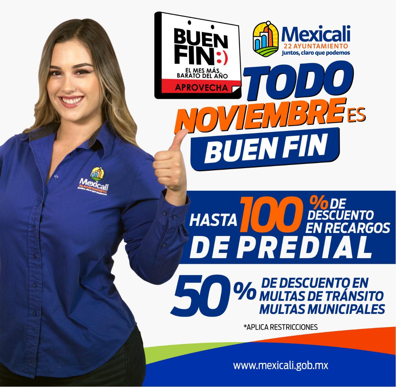 Con motivo del Buen Fin el 22 Ayuntamiento de Mexicali a través de la oficina de Recaudación de Rentas Municipal ofrecerá el 100% de descuento en los recargos del Impuesto Predial y 50% de descuento en multas de tránsito y Reglamentos Municipales.