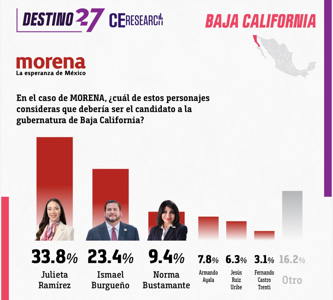 De acuerdo al estudio estadístico de la empresa CE Research, Julieta Ramirez tiene en estos momentos el 33.8 por ciento de las preferencias, por un 23.4 del alcalde de Tijuana, Ismael Burgueño.